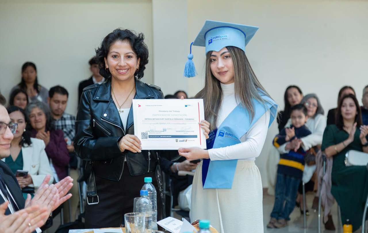 » Gabriel Castro entregó, a nombre de los compañeros de promoción, una placa de agradecimiento a Noralma Ordóñez, representante de Europeek Instituto de Idiomas.