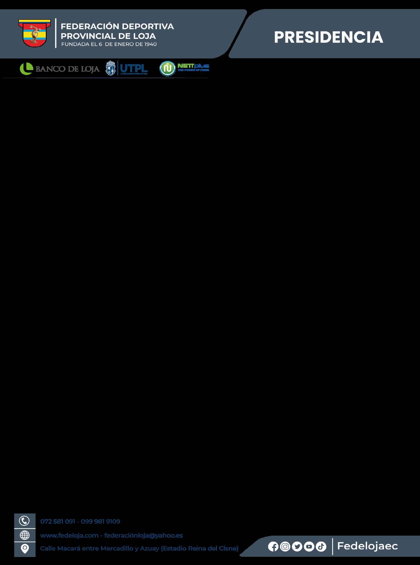 En atención al Art. 14 del Reglamento Sustitutivo al Reglamento General de la Ley del Deporte, Educación Física y Recreación, CONVOCO POR SEGUNDA OCASIÓN a ASAMBLEA GENERAL ORDINARIA DE LA FEDERACIÓN DEPORTIVA PROVINCIAL DE LOJA, a llevarse a efecto el día viernes 24 de octubre del 2025, a partir de las 19h30, medi ante la plataforma zoom, cuyo link de acceso lo estaremos remiti endo con la anticipación debida, con el objeto de tratar el siguiente orden del día: