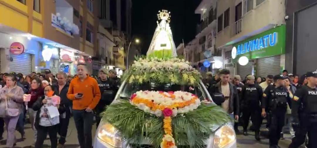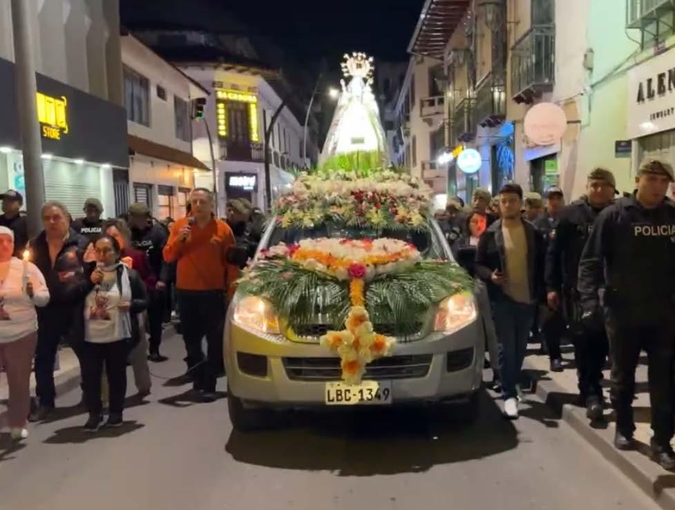 La imagen lució un vestido verde adornado con flores multicolores y fue resguardada por efectivos de la Policía Nacional. Devotos y líderes religiosos de la ciudad, entre ellos monseñor Walter Heras Segarra, obispo de la Diócesis de Loja, y el párroco de El Sagrario, William Arteaga, acompañaron el recorrido.
