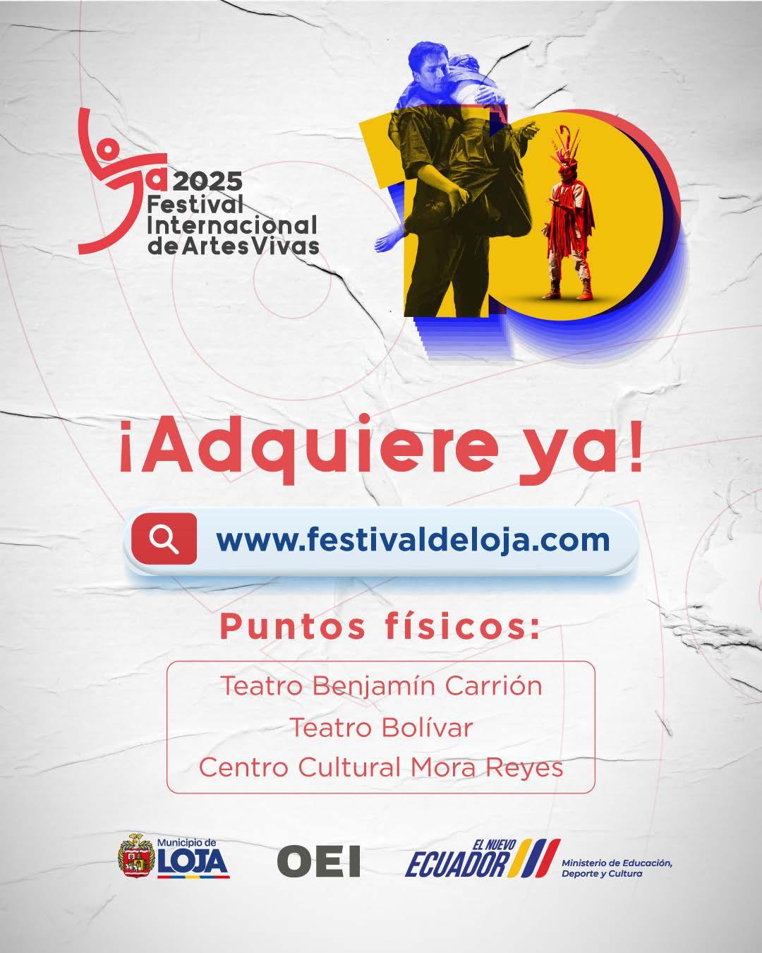 › Las entradas están disponibles en puntos físicos del Teatro Benjamín Carrión, Teatro Bolívar, Centro Cultural Alfredo Mora Reyes o a través de la página web www.festivaldeloja.com.