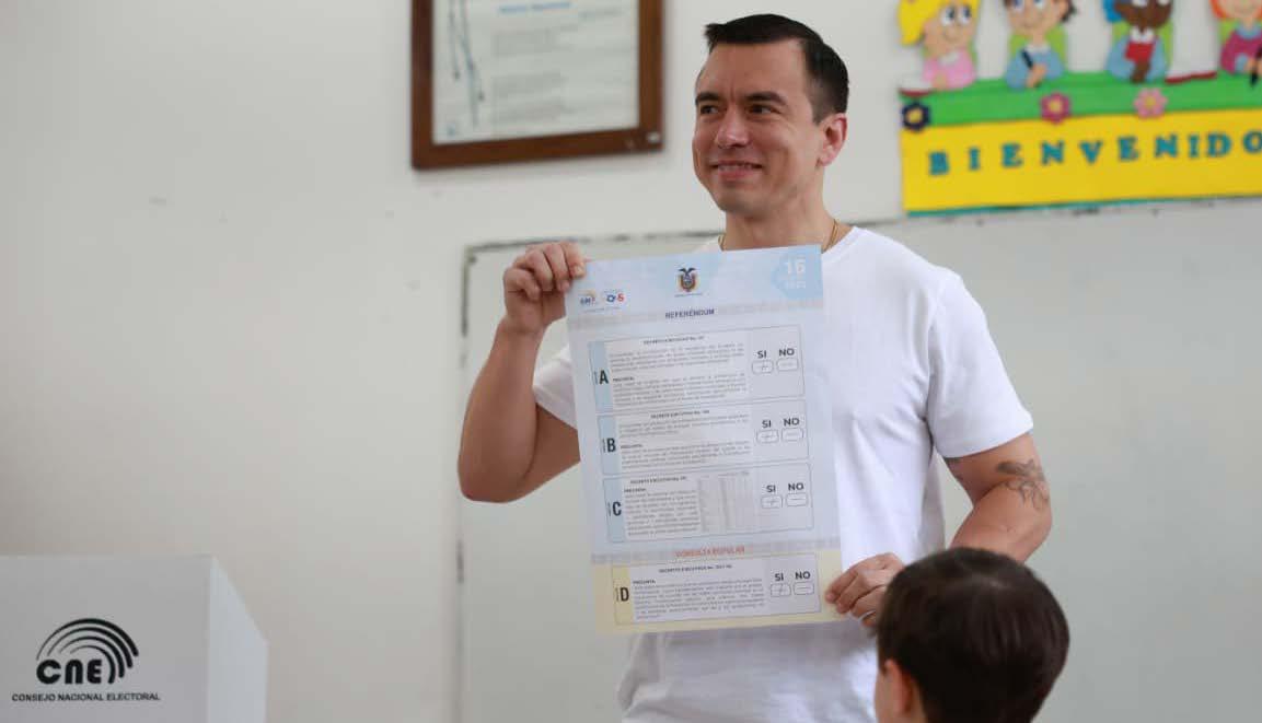 El presidente de la República, Daniel Noboa, aproximadamente a las 21:15, a través de su cuenta en X (Twitter), señaló: “Estos son los resultados. Consultamos a los ecuatorianos y ellos han hablado. Cumplimos con lo prometido: preguntarles directamente. Nosotros respetamos la voluntad del pueblo ecuatoriano. Nuestro compromiso no cambia; se fortalece”.