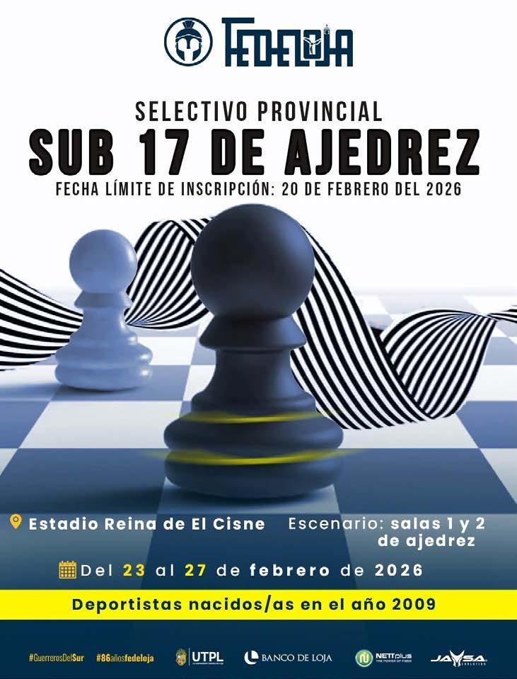 Federación Deportiva Provincial de Loja invita a todas las Liga Deportivas Cantonales, clubes, academias particulares y unidades educativas a participar del selectivo provincial que tiene como objetivo la conformación de los equipos que representarán en el Selectivo Nacional Escolar 2026 y el equipo que representará en los próximos Juegos Nacionales Prejuveniles 2026, en la disciplina de ajedrez.