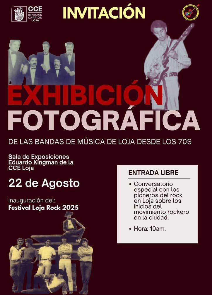 El viernes, 22 de agosto de 2025, a las 10:00 en el Salón Eduardo Kingman del Teatro Casa de la Cultura de Loja (CCE-LOJA), “Segundo Cueva Celi”, se hará la inauguración de la exhibición de instrumentos, vinilos, libros y más, de bandas de música desde los años 70.