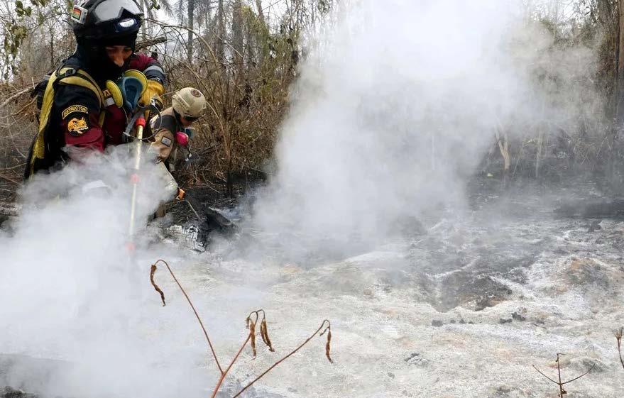 Por su parte, el viceministro de Defensa Civil, Juan Carlos Calvimontes, explicó que uno de los incendios que combaten con 77 bomberos está en el parque nacional Noel Kempff Mercado, ubicado en la región oriental de Santa Cruz.