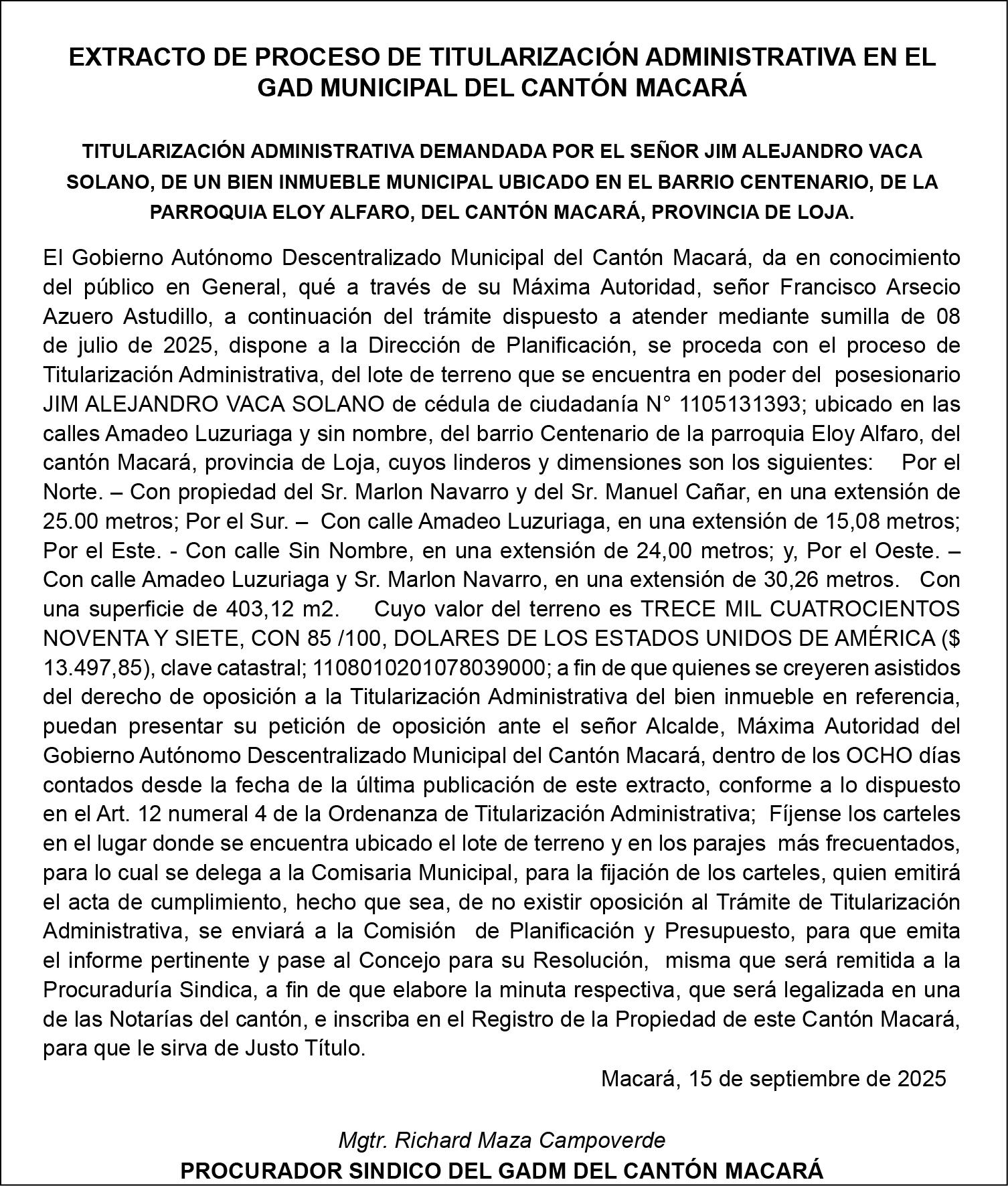 Espera que la alcaldesa Guayanay dé una salida porque el exburgomaestre removido, Franco Quezada, nada hizo. Asimismo, anuncia que elaborará un borrador de convenio donde se dará a cada institución su responsabilidad: Corporación Eléctrica del Ecuador (Celec), que construyó las vías, y el Municipio, la red de agua potable y el alcantarillado. Allí también involucrará a la Gobernación en condición de