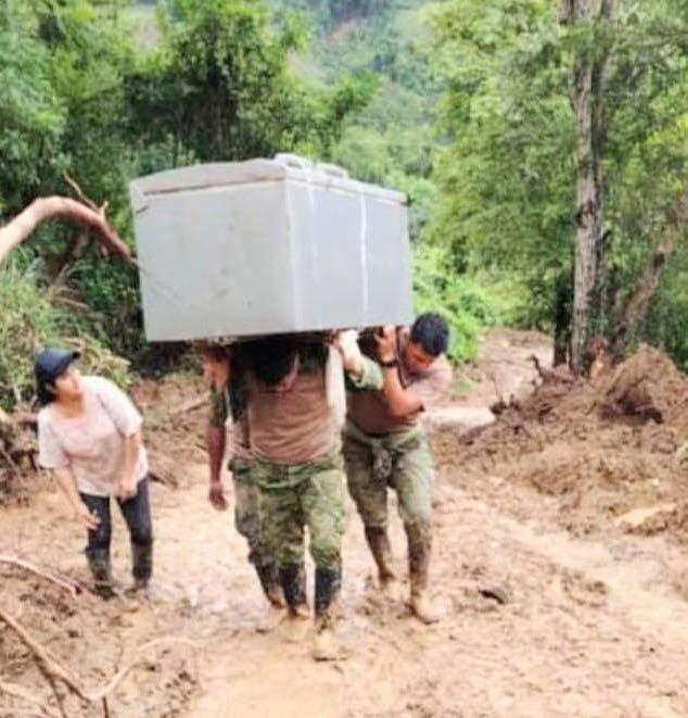 Los soldados de la Brigada de Infantería Motorizada Número 7 ‘Loja’ ejecutan labores de evacuación de los bienes de las personas afectadas por la temporada invernal en el cantón Pindal, de la provincia de Loja; también, realizan la limpieza de las vías.