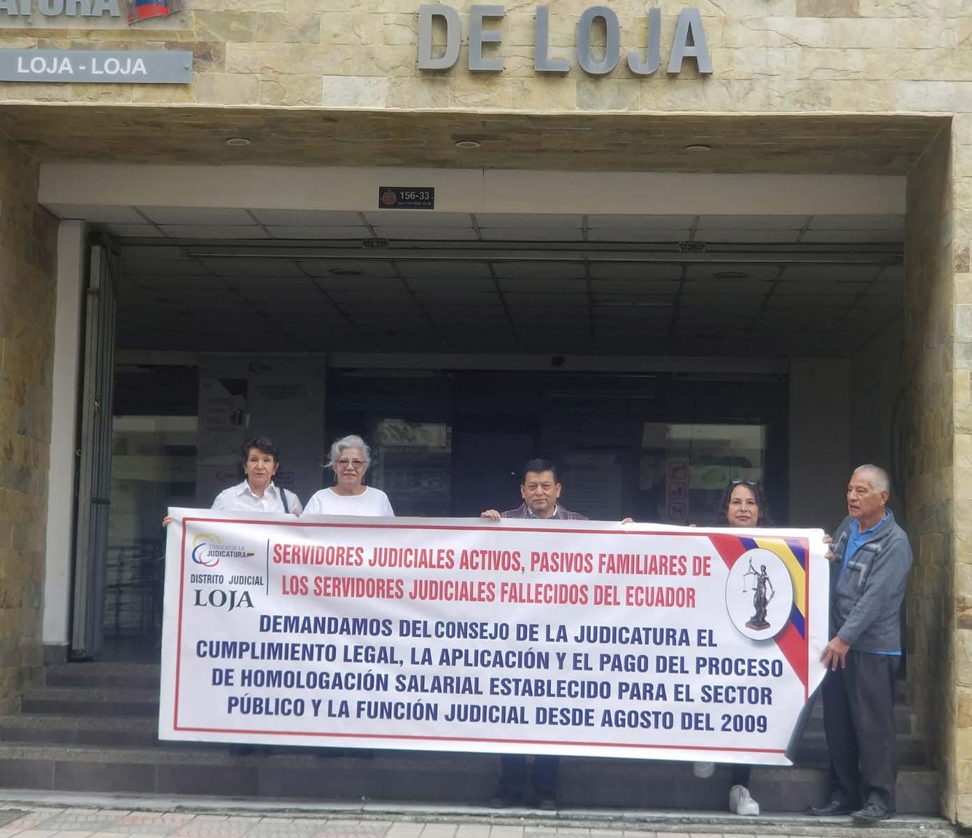 En los exteriores de la Corte de Justicia, en la ciudad de Loja, el lunes 23 de febrero de 2026, servidores judiciales activos y pasivos, así como familiares de servidores judiciales fallecidos, protagonizaron un plantón con el objetivo de exigir al Consejo de la Judicatura el cumplimiento legal y el pago del proceso de homologación salarial establecido para el sector público y la Función Judicial desde agosto de 2009.