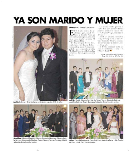 Los recién casados pasaron al centro de la pista y al escuchar las primeras notas de la canción “Sabes”, de Alex Ubago, comenzaron el baile. Judith y Orlando estuvieron acompañados por sus padres, Pablo y Consuelo Cabrera, así como Oscar Parra (†) y Lidia Parra, respectivamente. El festejo continuó hasta pasada la medianoche a ritmo de “Calera’s Band”. cla se_ editor@horacero.com .m x Tels. 929.75.85 al 87. Ext. 106