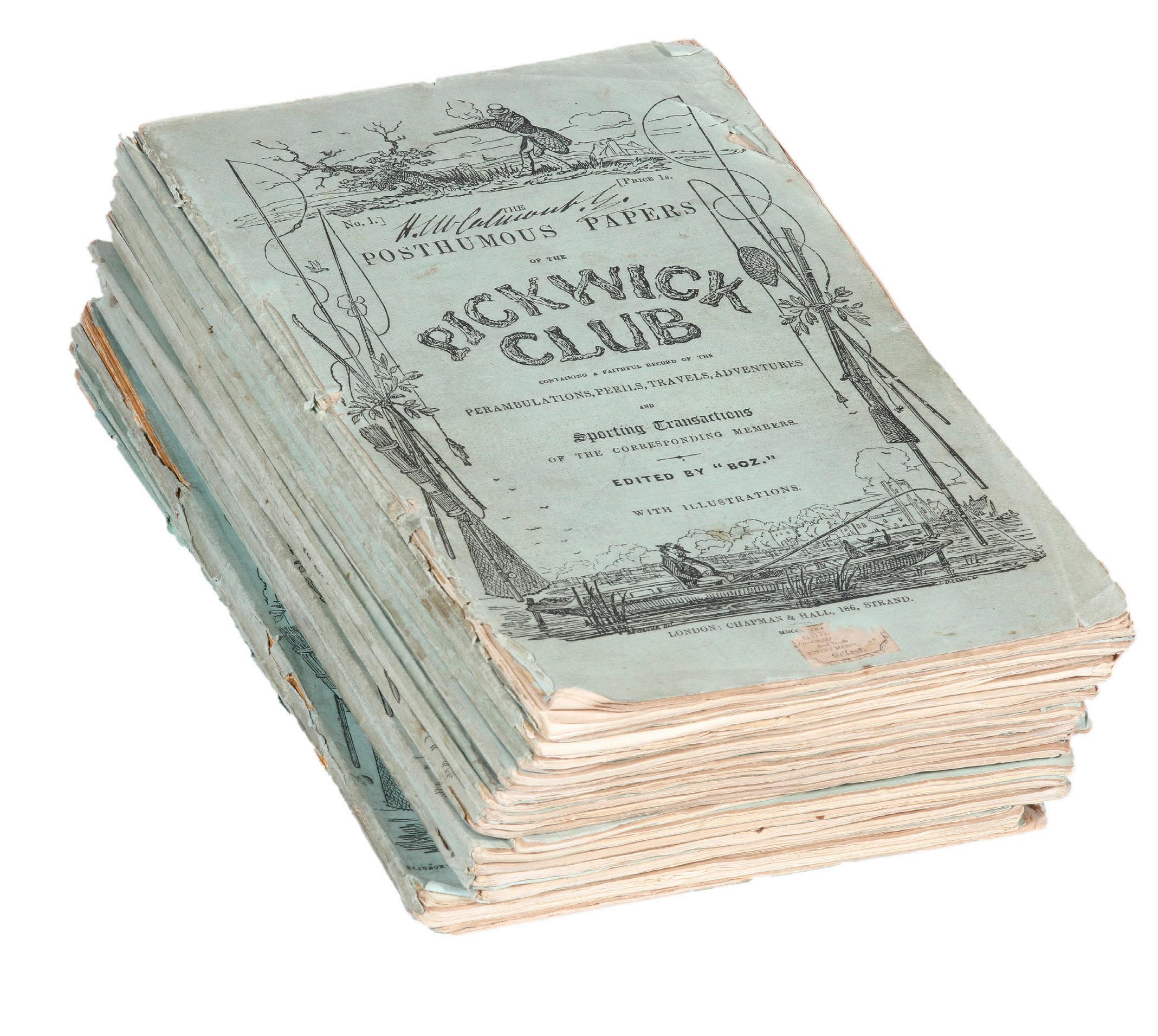 In the past collectors have been anxious to acquire so-called “prime” sets, composed only of first states or issues of the various components. This was especially the case in the 1930s when enormous premiums were paid. Since only a few hundred copies of the first few parts were published in 1836, and those parts were later reprinted to meet demand as the novel’s