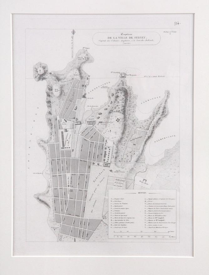 4. FREYCINET, Louis de. Esquisse de la Ville de Sydney, Capitale des Colonies anglaises, à la Nouvelle-Hollande. Engraved map measuring 320 x 237 mm. (plate size), a very good copy, mounted and framed. Paris, Pillet Aine, 1825.