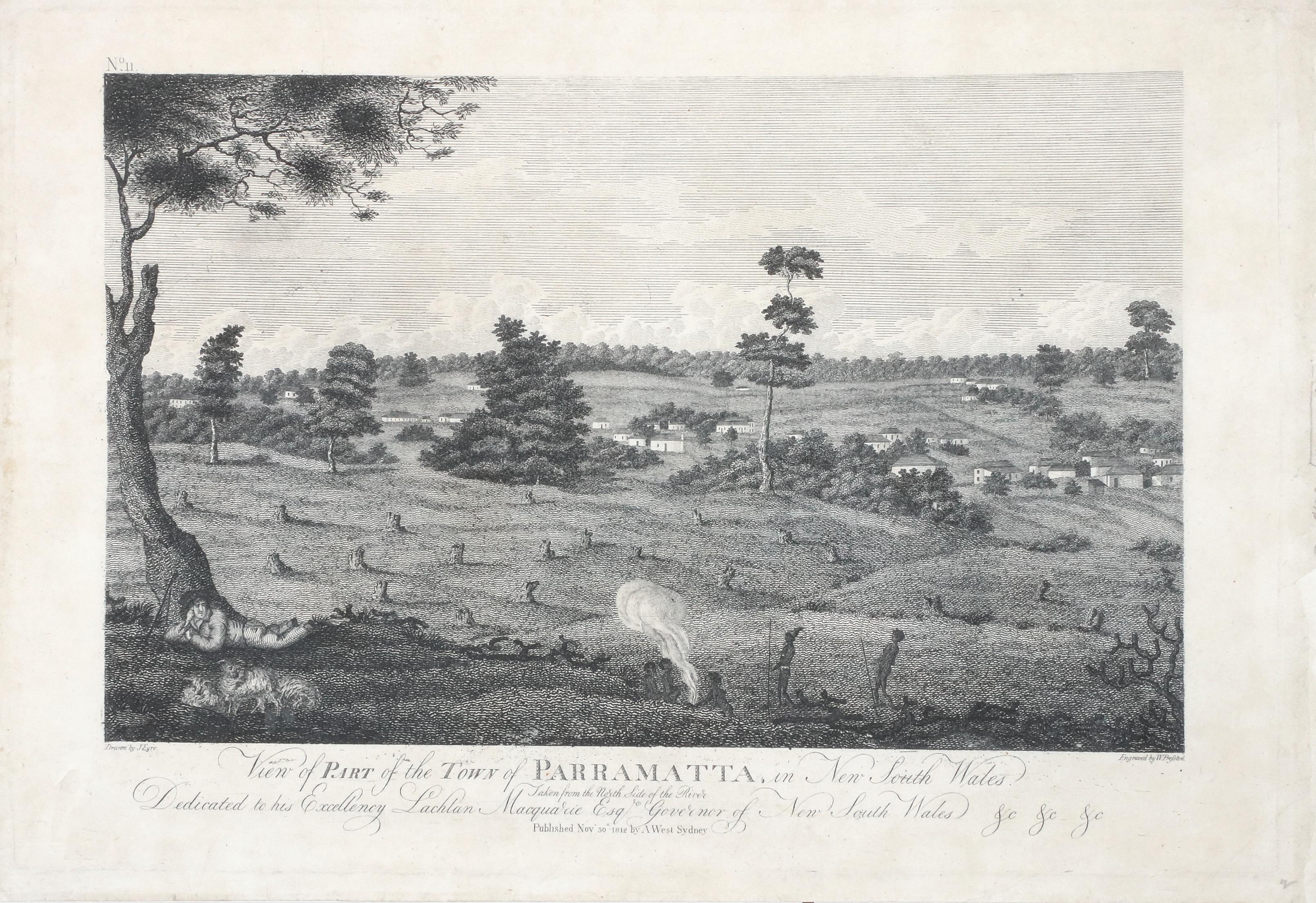 Number 11 in West’s series, published on 30 November 1812. It offers a dramatic depiction taken from the north shore of the Parramatta River, looking southward towards the main part of the settlement and is an honest appraisal of how the town actually looked: the field of stumps points to the rapid rate of expansion at the time. The figures grouped in the foreground make a curious tableau with, at left, a settler who is apparently a type of shepherd, and a grouping of five Aboriginal figures in the middle ground. West’s engraving portrays the “real” Parramatta of 1812;
