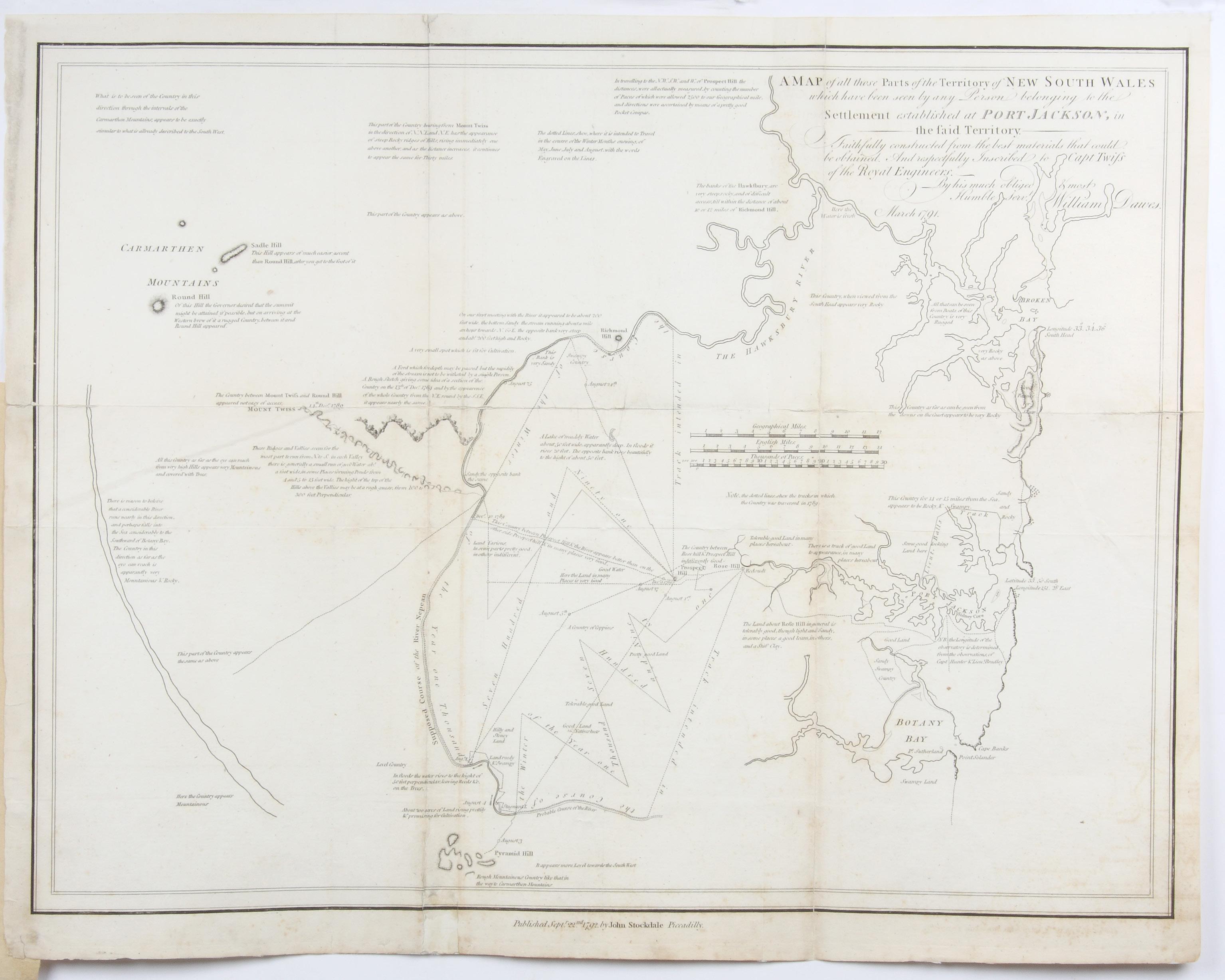 The map bears an engraved dedication from Dawes to Captain Twiss of the Royal Engineers dated March 1791, although it was not engraved and printed in London until September of the following year. It was included in John Hunter’s Historical Journal of the Transactions at Port Jackson, published by John Stockdale in 1793.