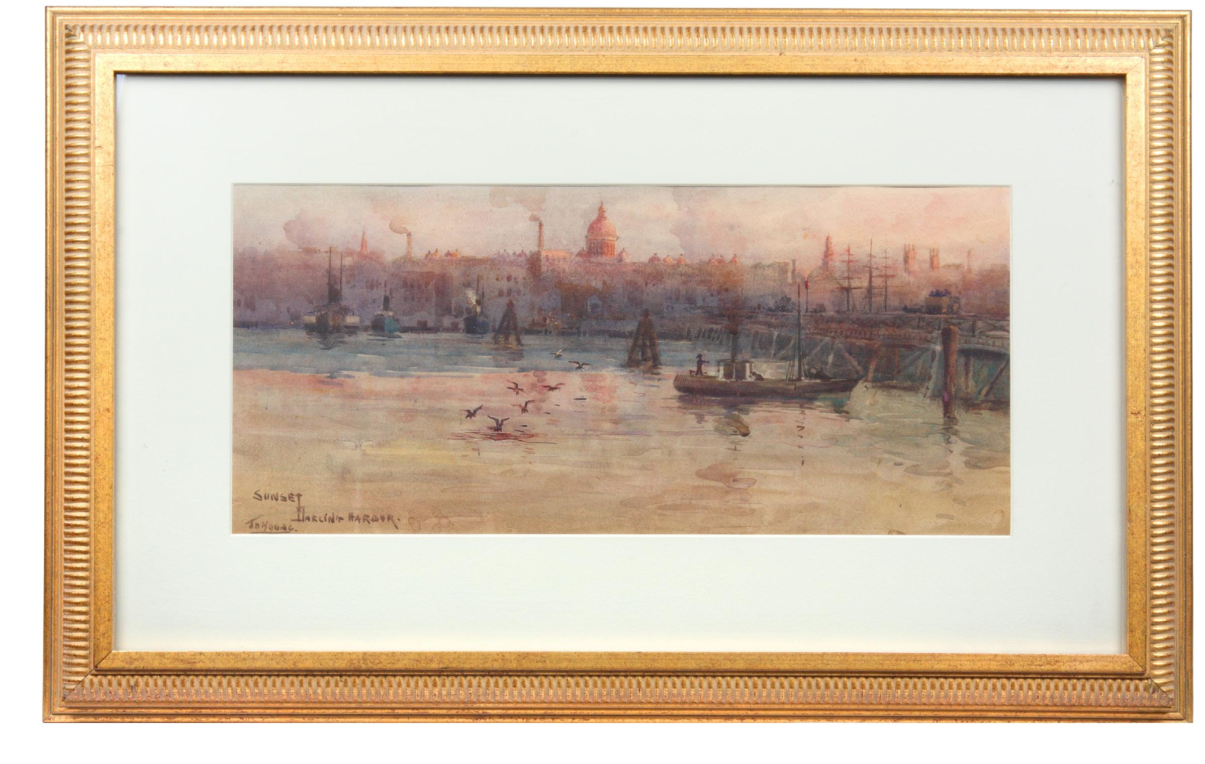 A fine watercolour of Darling Harbour, by well-regarded turn-of-the-century Sydney artist John Henry Young. This atmospheric watercolour, imbued with the pink light of early evening, shows a most attractive view of the burgeoning metropolis of Sydney seen across the waters of Darling Harbour. The domes of the newly-completed Queen Victoria Building (finished in 1898), the Town Hall and the spire of St. Andrew’s Cathedral are visible on the skyline, as are a number of smoke stacks, which give a clear sense of the industrialisation of inner Sydney at the time. Pyrmont Bridge is to the right of the scene with passengers traversing it in two horse-drawn omnibuses.