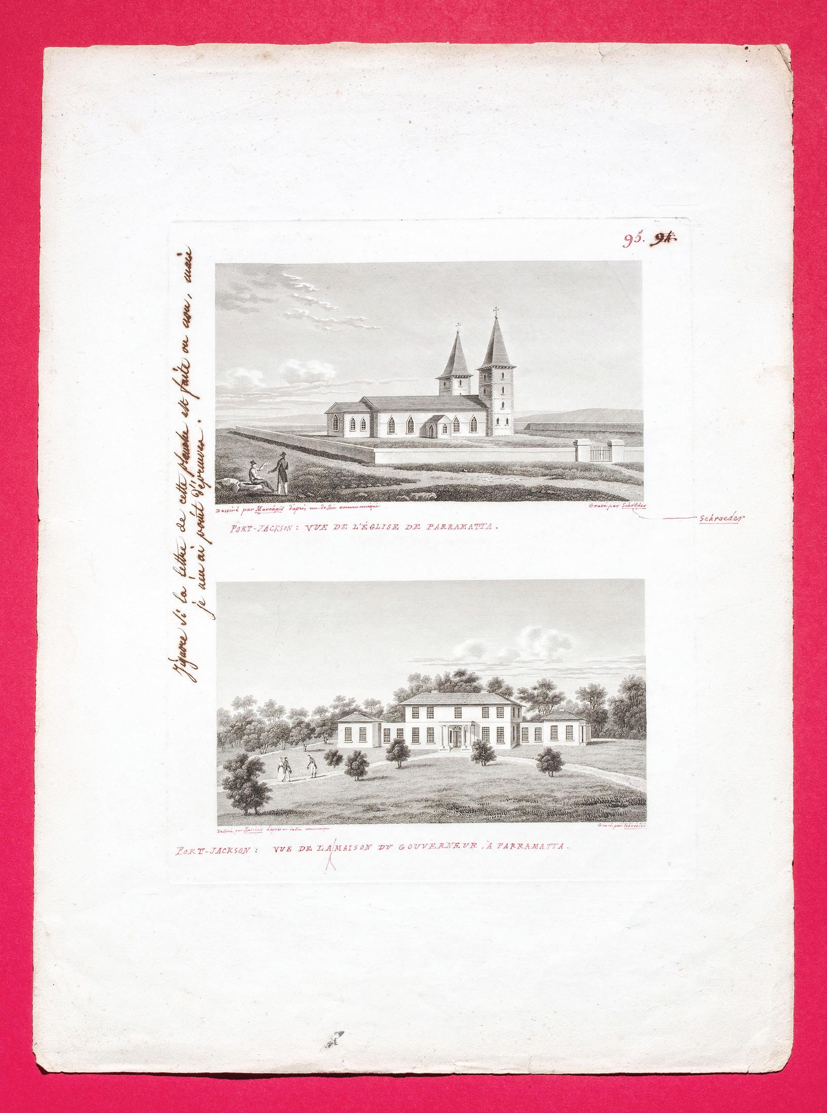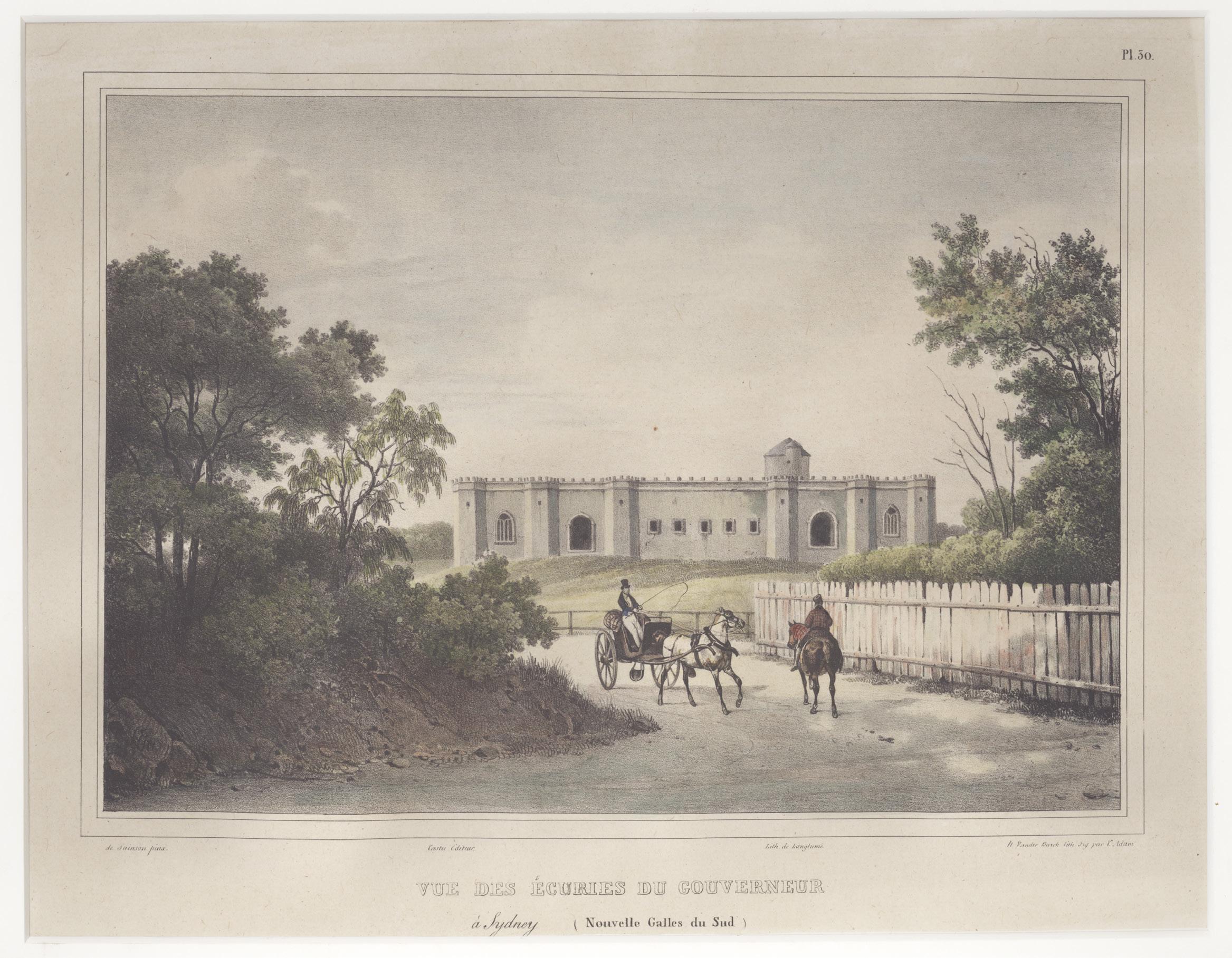 An excellent early view of Government House and its gardens, based on an original drawing by Viscount de la Touanne, a French aristocrat attached to Bougainville’s expedition which visited Sydney in 1825 in the Thetis and Esperance. As Dyer notes (The French Explorers and Sydney, Brisbane, 2009, p.107), this second visit by Bougainville to the colony was one of great happiness; there were many invitations issued and Touanne would often accompany Bougainville to dinners and visits to country homes. When time permitted Bougainville, as probably his countrymen also did, would walk in the gardens of Government house and along Mrs Macquarie’s Road. The French officer accompanying an elegantly dressed Sydney lady in the foreground of the image is echoed by a family group of kangaroos on the lawns.