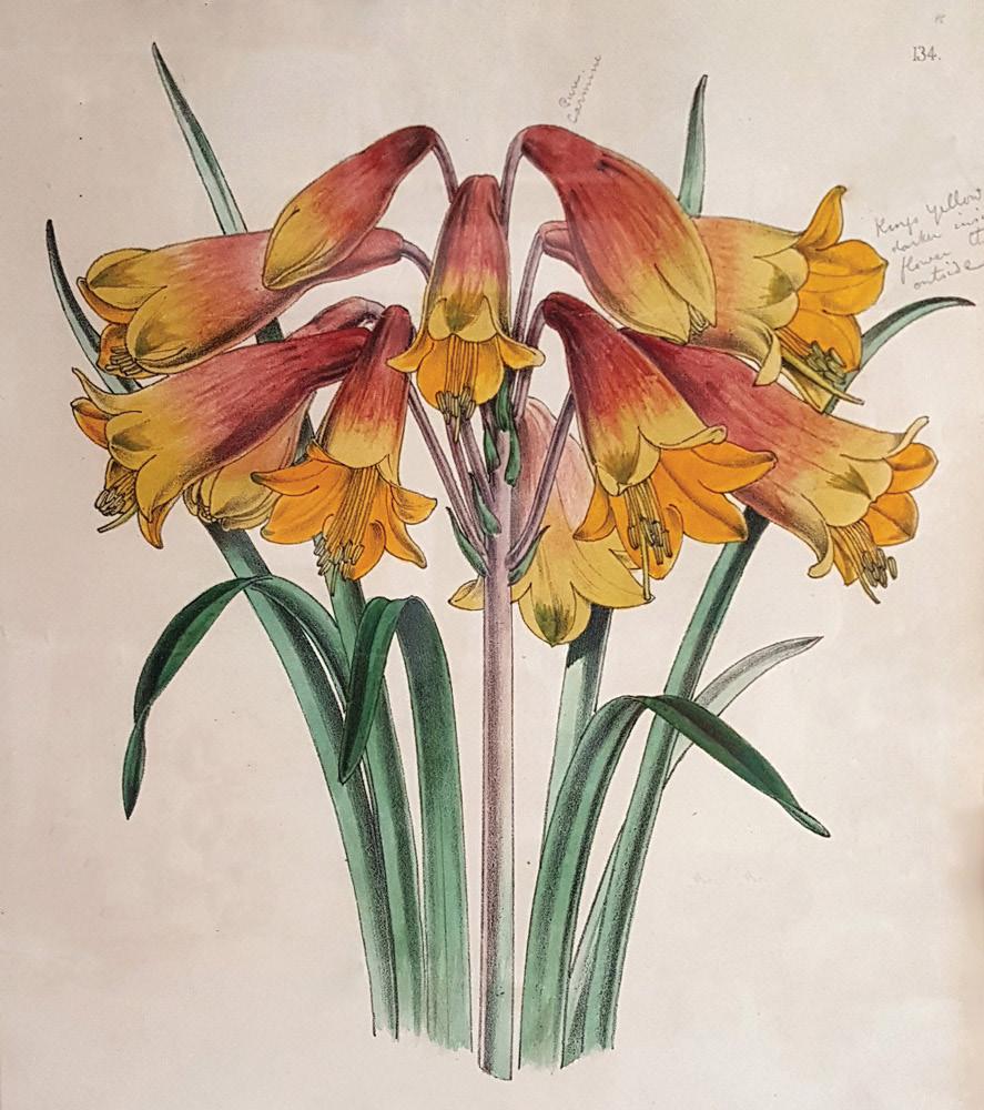Blandfordia Grandiflora (also known as flammea), now commonly known as the Christmas Bells, was named by the prodigious Robert Brown in 1810 from specimens collected in the Hunter River. As with many Australian natives, no sooner had specimens been sent to Eng land than the demand from nurserymen for seed propagation ensued. In 1854, Curtis’ Botanical Magazine sang the praises of what was “unquestionably the most beautiful and distinct of all” the specimens of Blandfordia. “The root was brought from the Sydney Botanic Garden (under the name of B.grandiflora) four years ago by Lord Walter Butler, to the Countess of Carrick, who presented it to Dr. Mackay. It appears to have been introduced to Sydney from Hunter’s River…”.