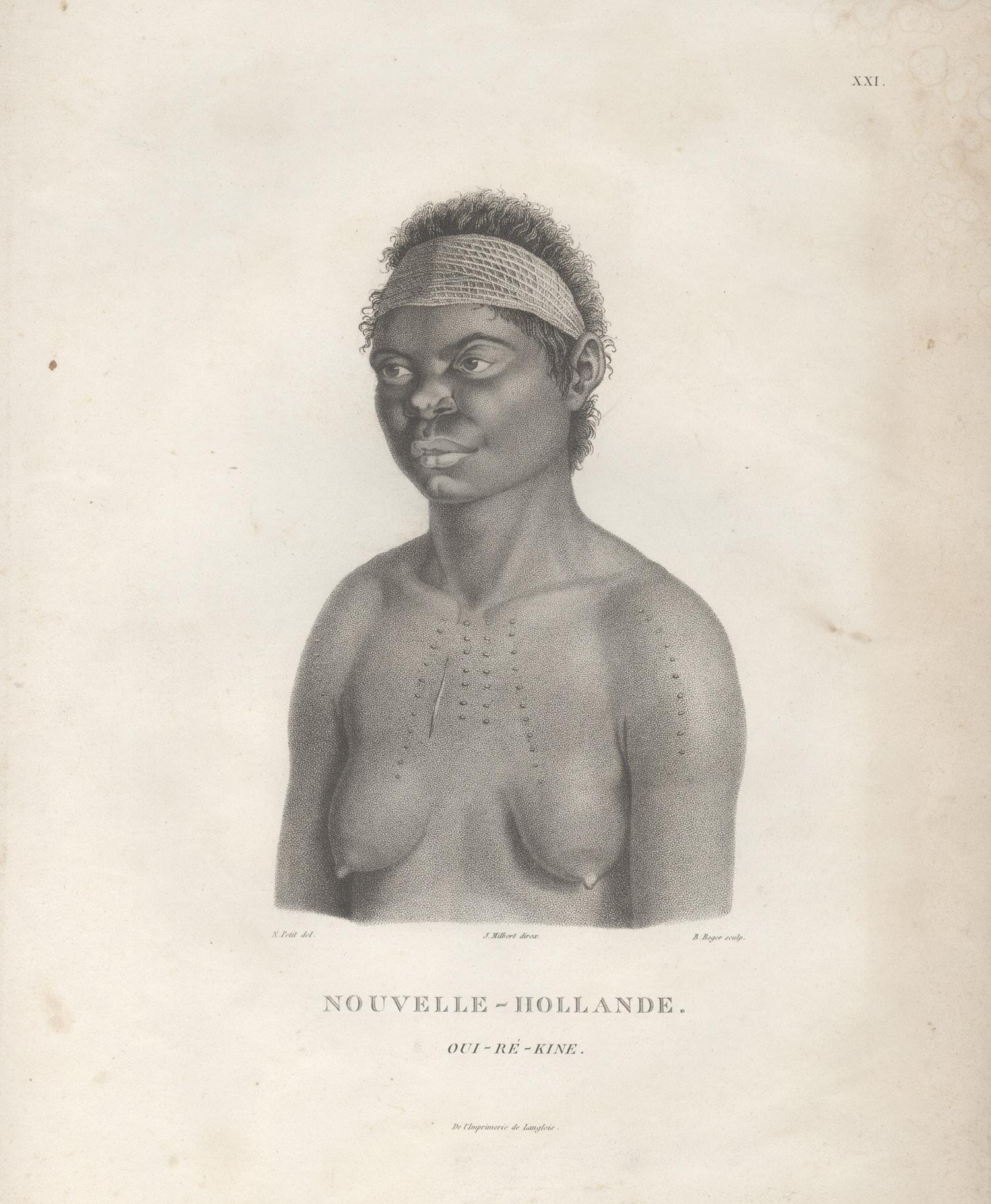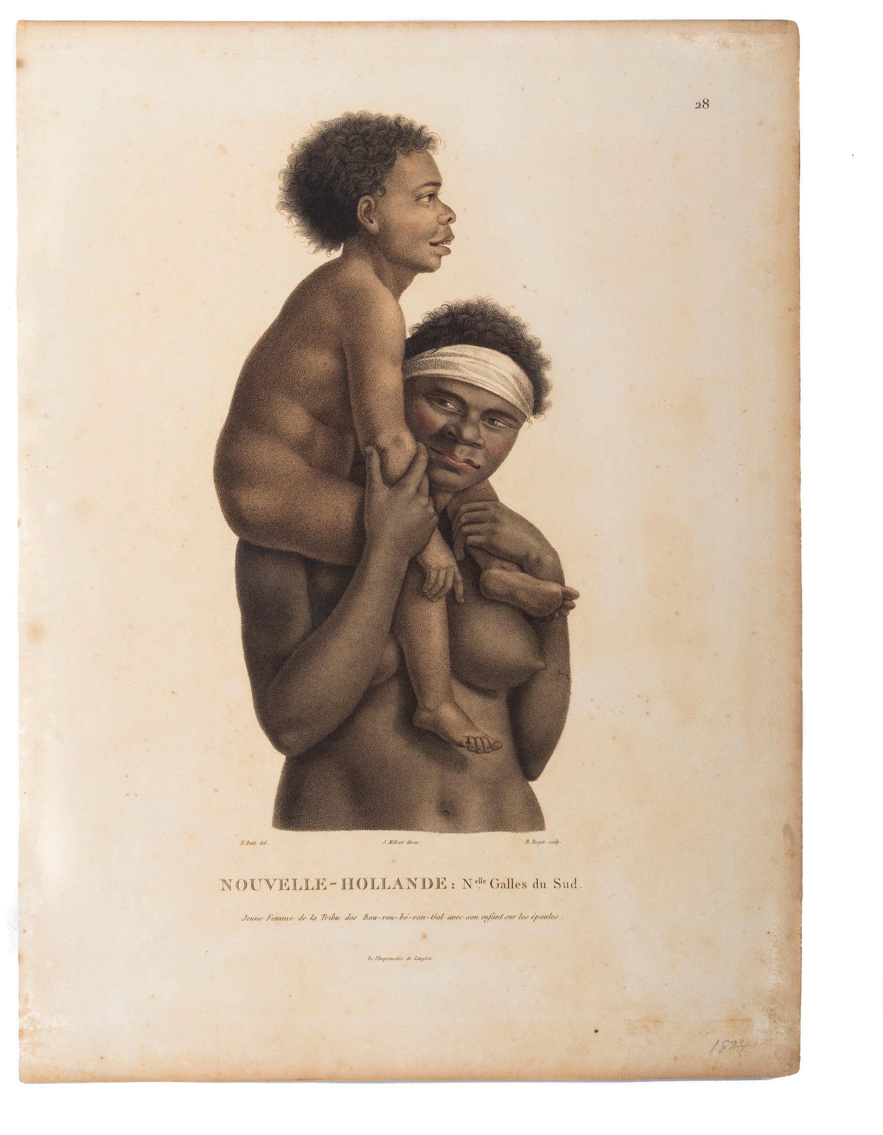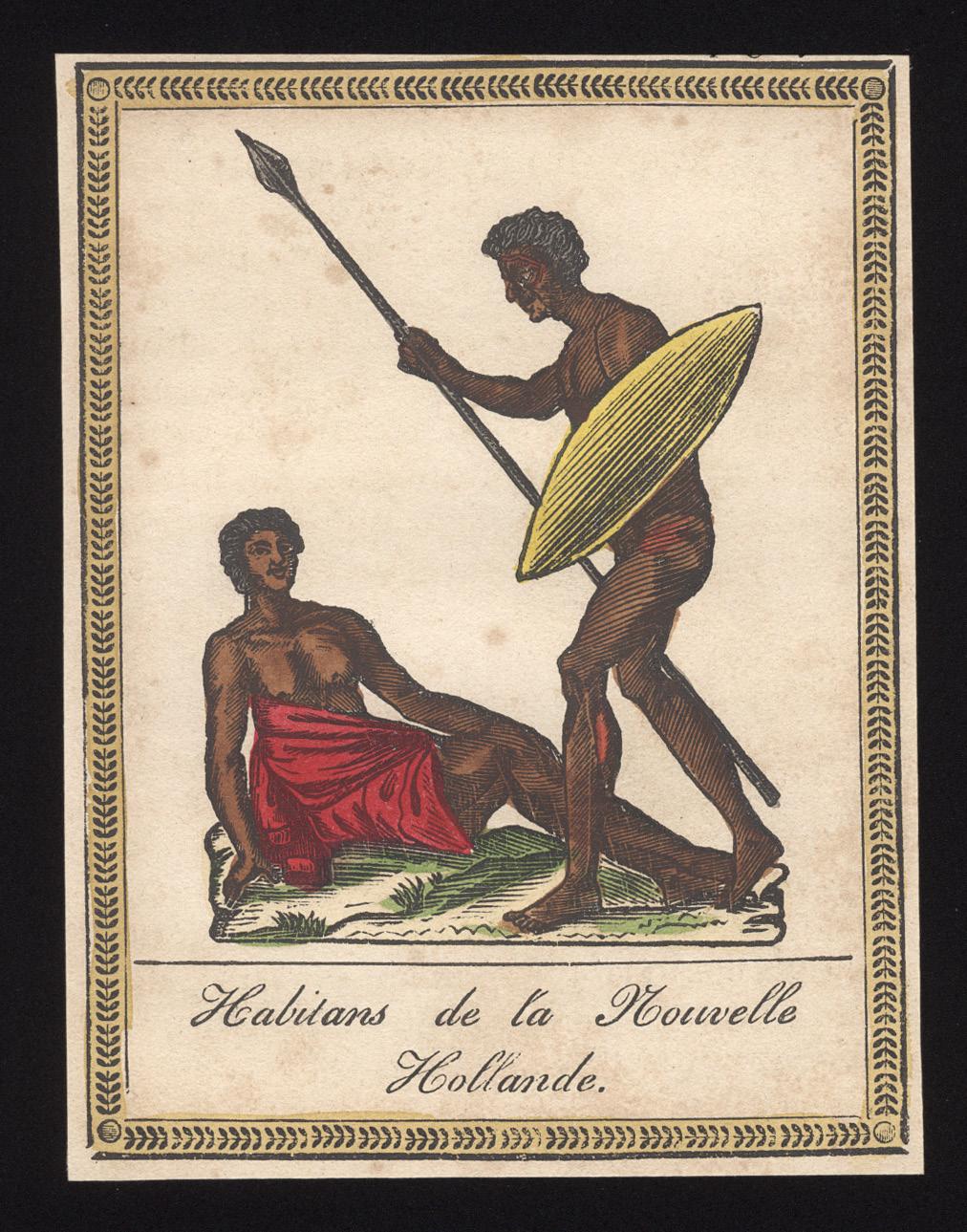 Charming French hand-coloured woodcut depicting a man and woman of “New Holland”. It was most likely printed as part of a series of costume plates, similar to those in the rare ethnographic survey prepared by Rudolf Schinz in the 1820s bringing together descriptions and images of the native inhabitants of Kamtschatka, Japan, China, Timor, Hawaii, Tahiti, Australia, North America and Africa from a number of published voyage accounts includ ing those of Cook, Langsdorff, Kotzebue, Krusenstern and Baudin. It may be the same as a similarly-sized woodcut of the same name held in the Rex Nan Kivell collection of the National Library (NK9989).