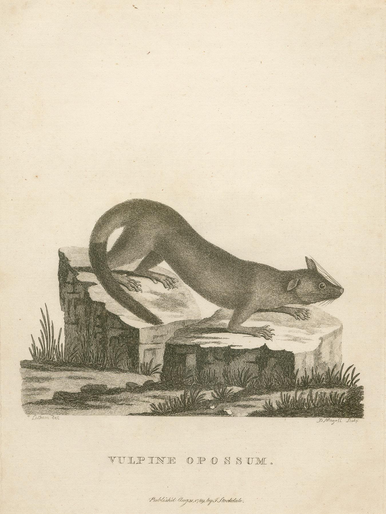 Original engraving, 260 x 190 mm. Mounted. London, John Stockdale, 31 August, 1789. Marvellous image of the “Vulpine Opossum” after an original drawing by Latham.
