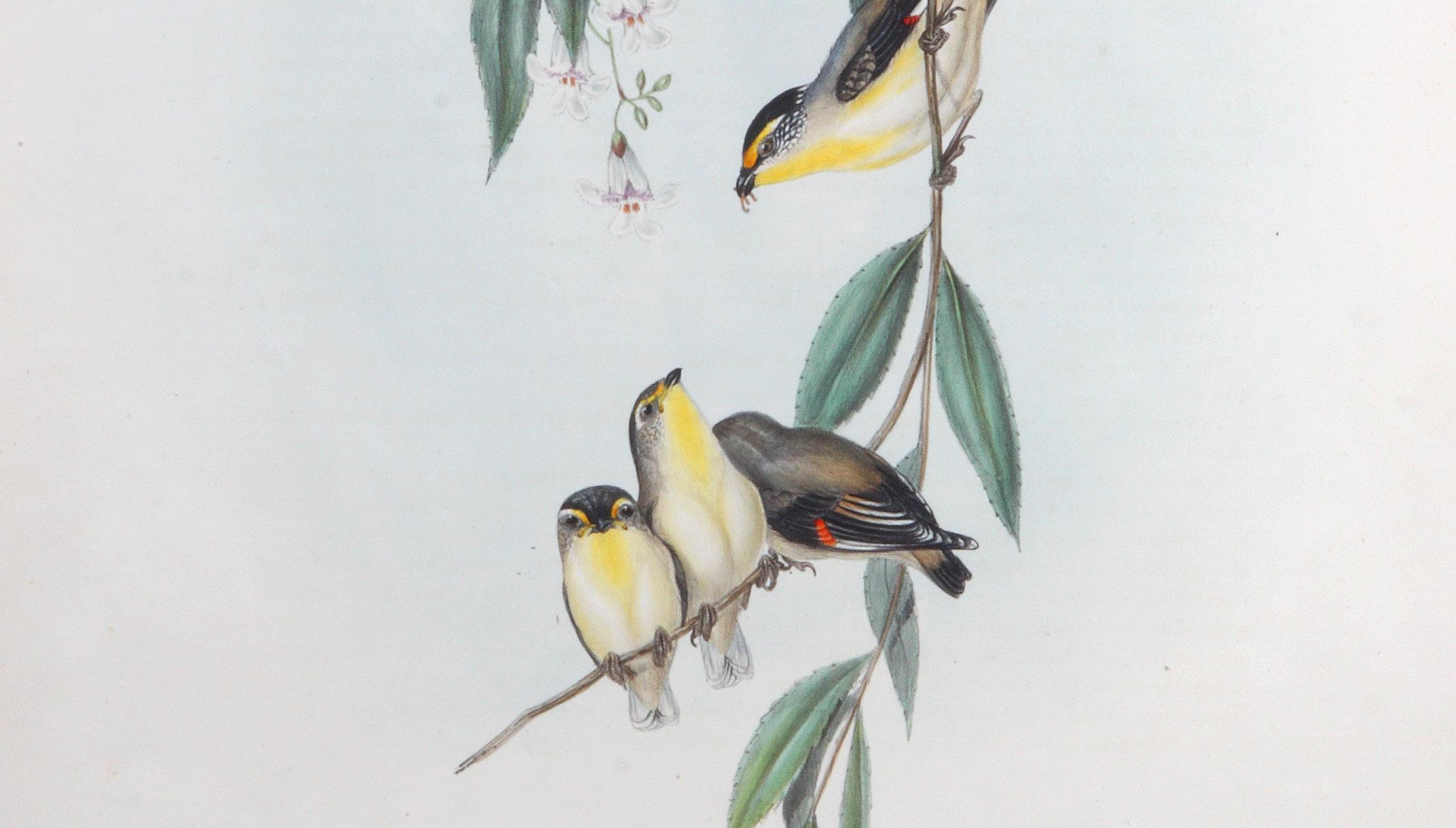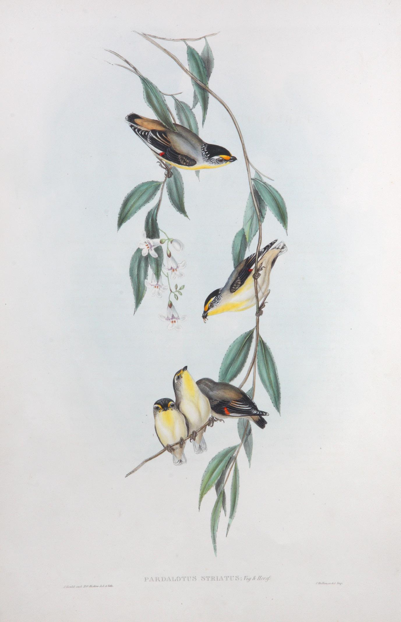 9. GOULD, John & RICHTER, H.C. Striated Pardalote (Pardalotus Striatus). Hand-coloured lithograph (510 x 350 mm.), with letter-press text. London, The Author 1840-1869. The original hand coloured lithographic plate from Gould’s most famous work, Birds of Australia of the male, female and three young Pardalotus Striatus, found in New South Wales and Western Australia at Swan River. Gould notes “this active little bird is generally seen seeking insects among the leaves… and gives a decided preference to the “Eucalyptia”. $1450 [4007934 at hordern.com] see description and illustrations at