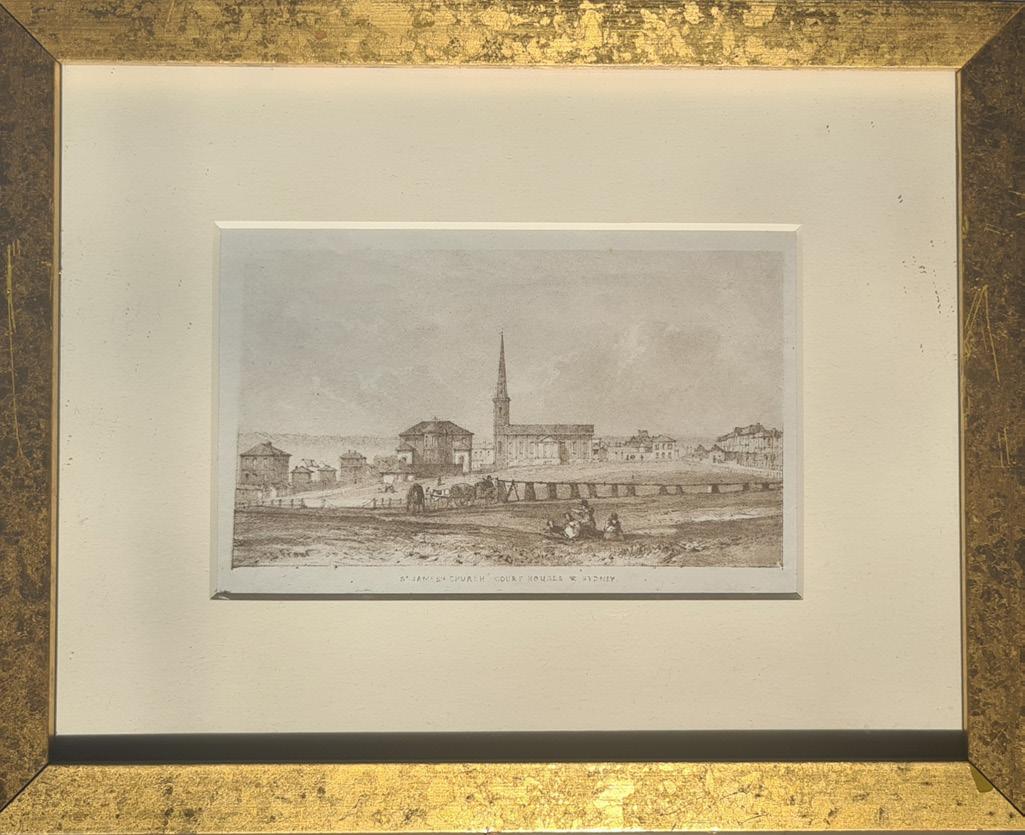 Four engraved views representative of Macquarie era Sydney, the work of distinguished Sydney engraver, painter and teacher John Black Carmichael (c.1803-1857), Sydney printer James Maclehose, and a view of St. James’s Church by colonial artist John Skinner Prout (18051876. Carmichael is also notable for having been one of the earliest free emigrant artists to pursue a lifelong professional career in New South Wales. (DAAO online).