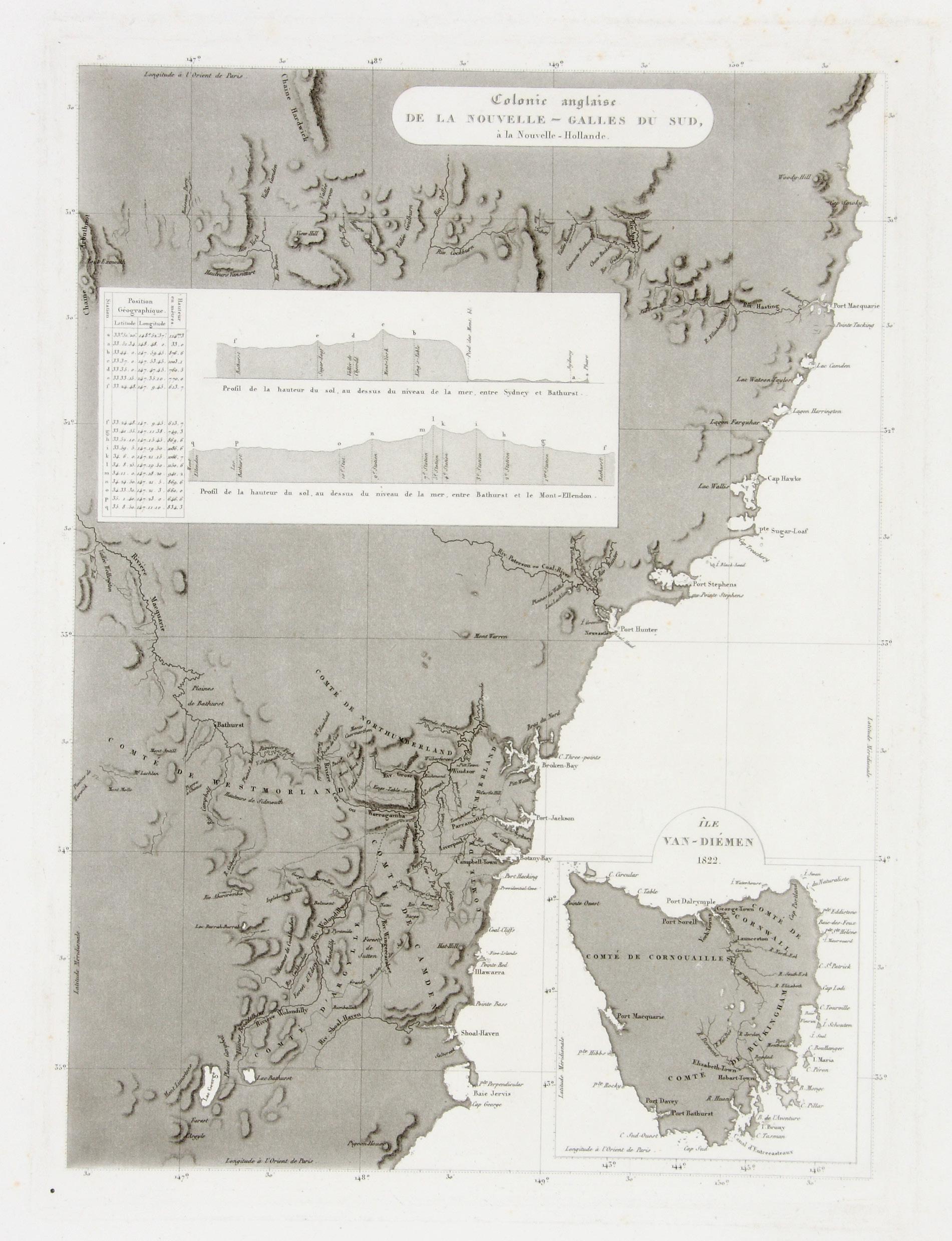 Intriguing map of New South Wales and Tasmania prepared by Louis de Freycinet for inclusion in the published account of his expedition titled Voyage autour du monde. This is an example of the first state without numerals. Of special interest is the inset detail of Van Die men’s Land, and two schematic elevation profiles (the first showing altitude from Sydney to Bathurst, the second from Bathurst to Mount Ellendon).