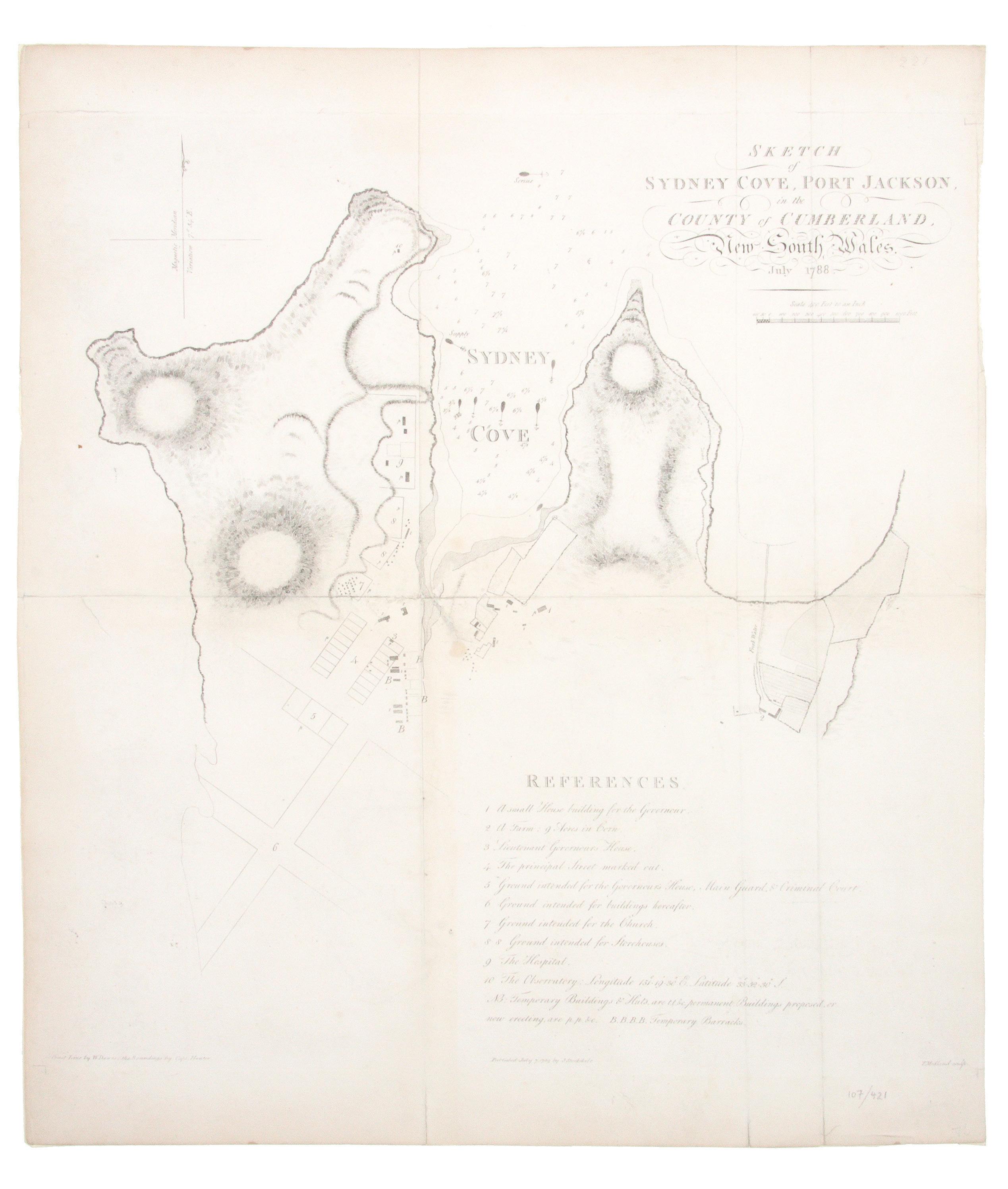 The map records numerous fascinating details, including the location of Government House and its grounds, the barracks, and the small observatory. ‘Shows Sydney Cove with soundings and seven of the First Fleet ships at anchor; Sirius as guard ship at the mouth of the cove. It shows the positions of temporary buildings and those of permanent buildings under construction with the areas allotted for farms. The farm with nine acres of corn is shown at the head of Farm Cove. A table of references identifies buildings and plots of land’ (Perry & Prescott, p. 52).