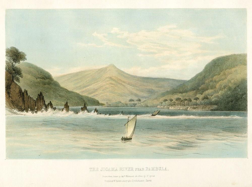 49. WESTMACOTT, Captain Robert Marsh. The Jigama River near Pambula. Handcoloured lithograph, 165 x 260 mm. Exeter, W.Spreat, circa 1840.