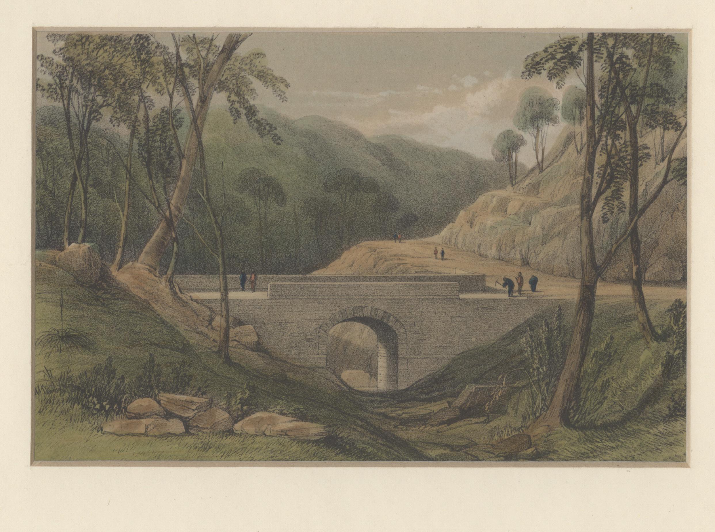 50. WESTMACOTT, Captain Robert Marsh. Road from Emu Plains, over the Blue Mountains… Hand coloured lithograph; fine, 131x200mm, mounted. Exeter, W. Spreats Lithographic Establishment, 1848. An attractive,original coloured lithographic view showing the first stone bridge built in New South Wales.