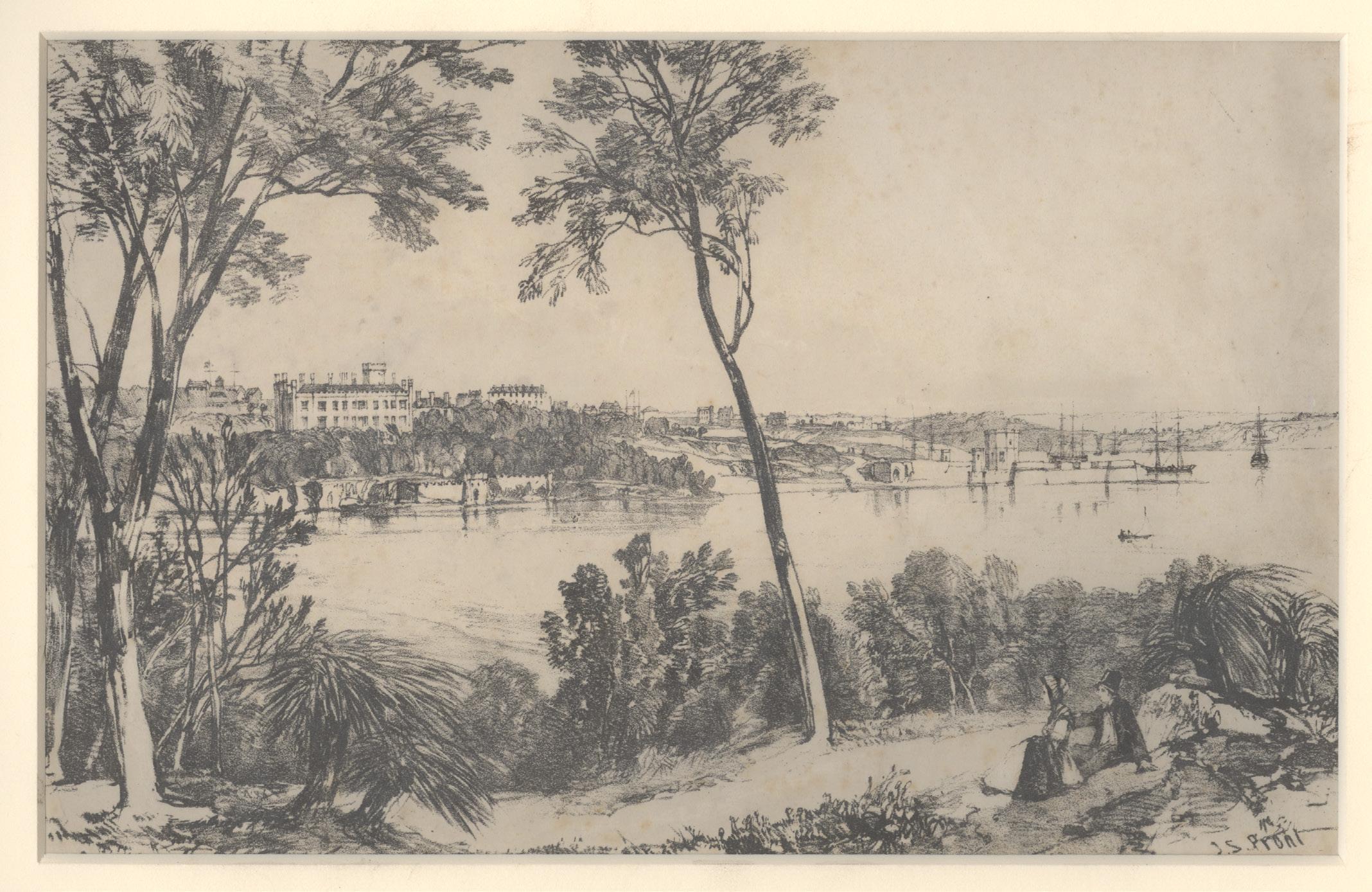 An idyllic view of Government House and its castellated bathing house seen across Farm Cove, from the Botanical Gardens. The signal station on Fort Phillip Hill is in the background to the left and Macquarie Fort to the right. The view was one of the suite of lithographs which Prout issued in Sydney Illustrated.