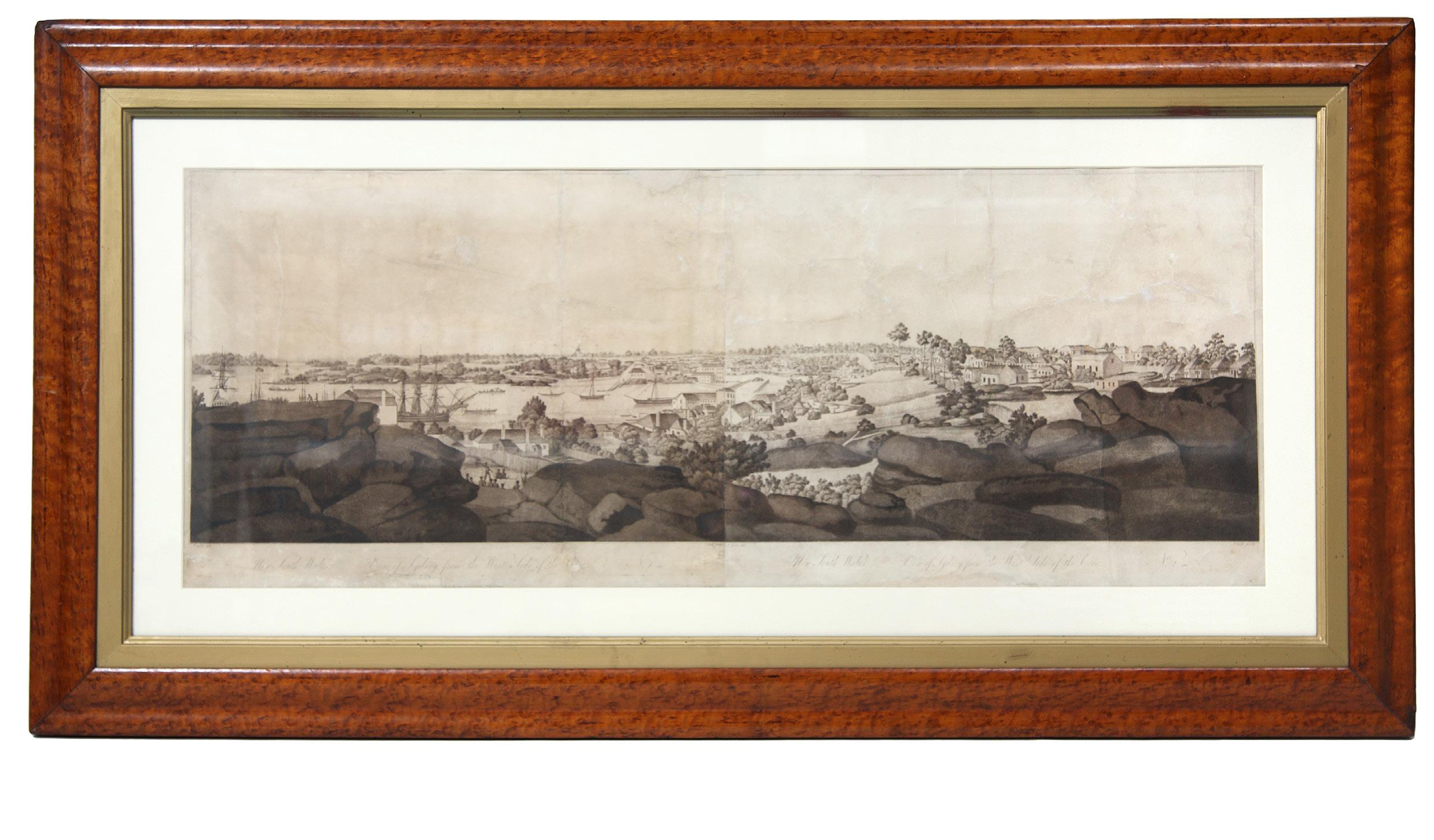 A rare panoramic view of Sydney Harbour. John Eyre arrived in New South Wales in 1801, transported for seven years for housebreaking. The first of his drawings which can be dated was done in 1804 soon after he received his conditional pardon. His best known work is this majestic panorama; the Sydney he portrays (fancifully) is a neat and orderly town where the Aboriginal inhabitants live with dignity and “peace, order and good government reign…” (The Antipodes Observed, 64). The focus is very much on the Harbour where the maritime activity was the dominating element in Sydney at the time. Eyre produced four images: two views from the West side of the Cove and two from the East; they were at least partly intended to illustrate David Dickinson Mann’s “Present Picture” of 1811, but are hardly ever to be found with copies of the book. Offered here are the two views from the West.