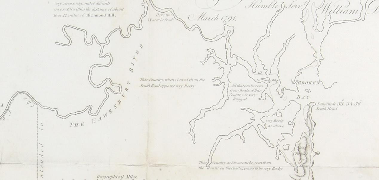 Important early map of the colony showing both coastal surveys and the extent of inland exploration attempted during the first three years of settlement. William Dawes is remembered as one of the most talented and humane officers of the First Fleet. A professional officer of the Royal Marines, Dawes volunteered for service in New South Wales, a decision in part motivated by a keen interest in the astronomy of the southern skies. He had already distinguished himself as an observer and astronomer, and came to New South Wales on the recommendation of the Astronomer Royal Nevil Maskelyne, charged with observation of a comet expected to arrive in 1788.