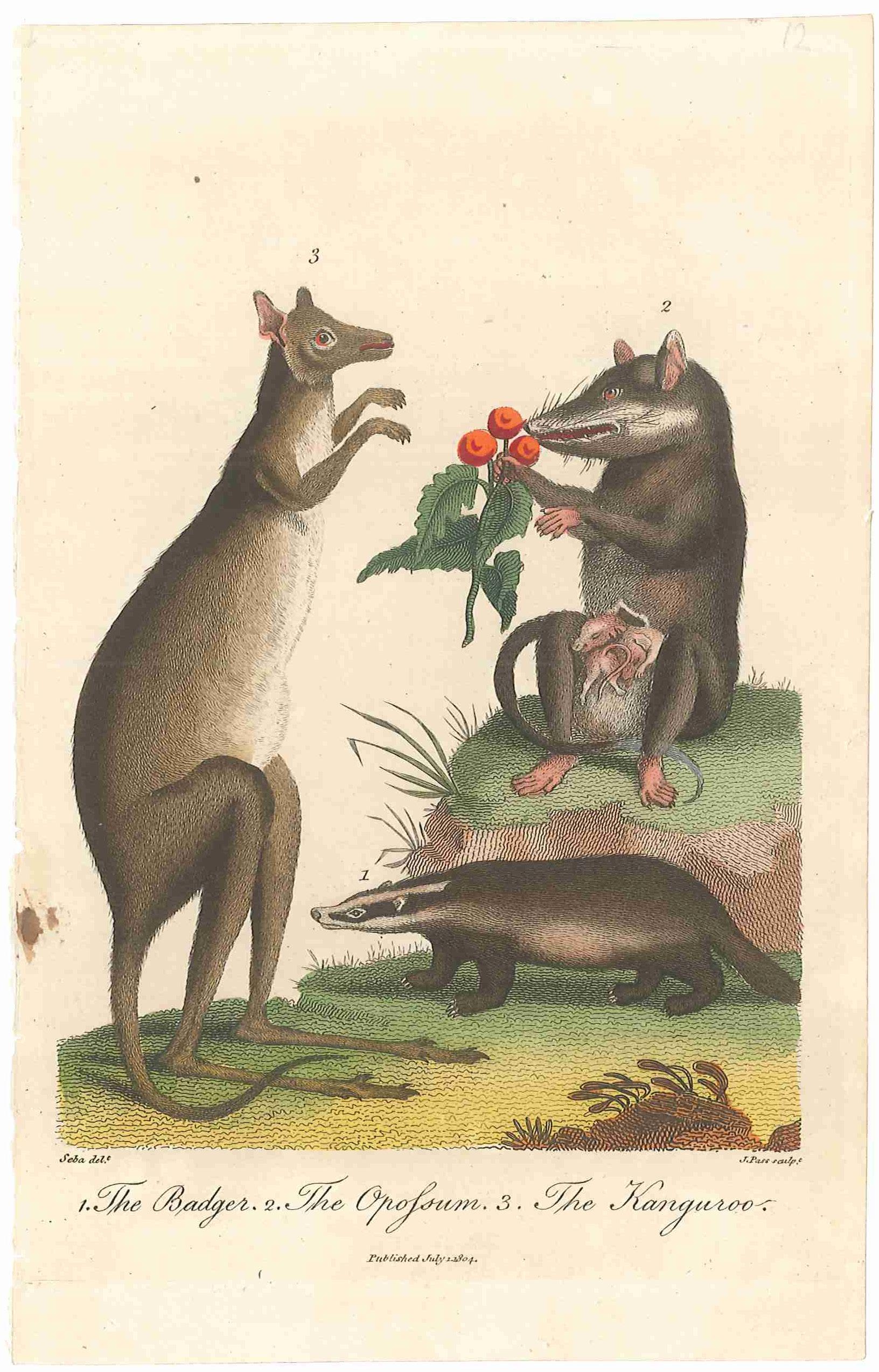 A curious and interesting hand-coloured engraving from An universal system of natural history including the natural history of man (1794-1810). Although the engraving is signed J. Pass after Seba, the kangaroo derives from the work of Sarah Stone and her illustration in John White’s Journal of a Voyage to New South Wales (1790), with the same posture and composi tion. White notes that “In its mode of propagation [the kangaroo] very probably comes nearer to the Opossum than any other animal” (Journal, 272), which makes the group in this engraving (with the opossum and her baby) particularly striking.