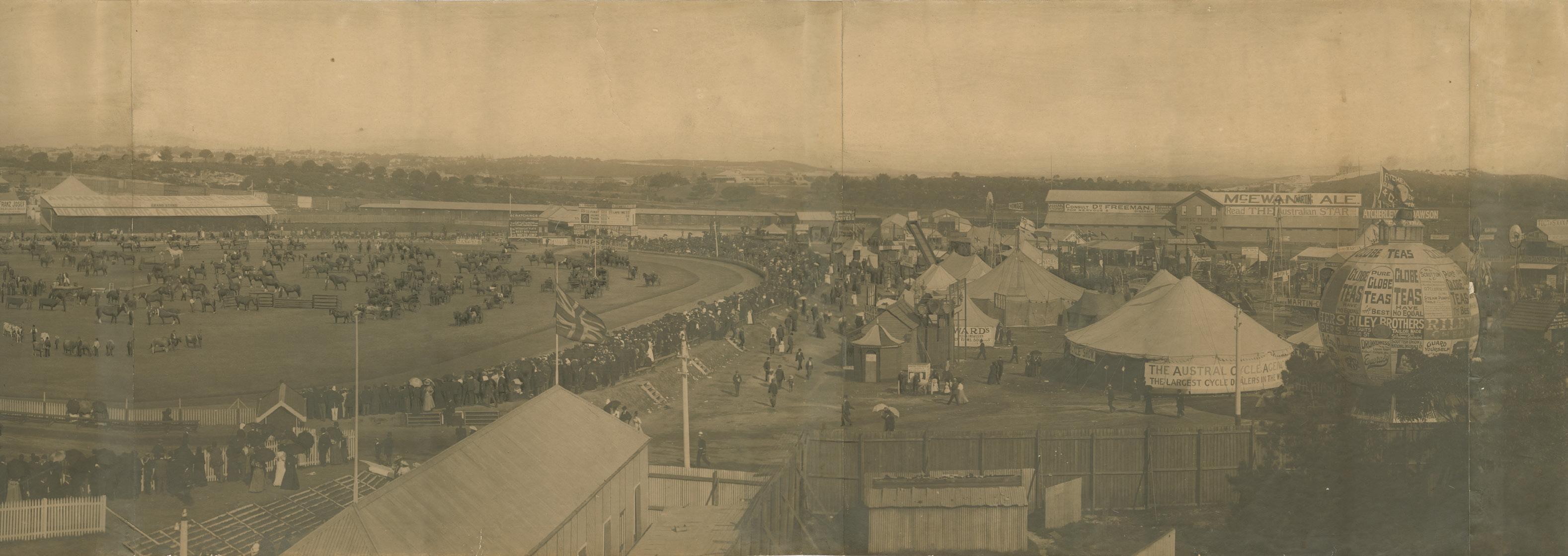 A rare very large panoramic photograph of the Royal Agricultural Show of 1897. The image is taken during the grand parade with the scoreboard in the background revealing details such as the fact that the Tattersalls Plate was due to be run at 2.30 pm, and the “Best Boy” rider to follow at 3. It is such extraordinary detail, displaying all of the activity and bustle of the show as well as the great splendour of the Moore Park grounds, that gives the image its real charm. In the background, for instance, the Cinematographe appears to be doing a good trade, while the hoardings and billboards are full of familiar names from the period, including Fry’s Cocoa, Tooths Ale, and the omnipresent Anthony Horderns (Samuel Hordern himself, as the printed list of office holders attests, was a vice-president of the RAS).