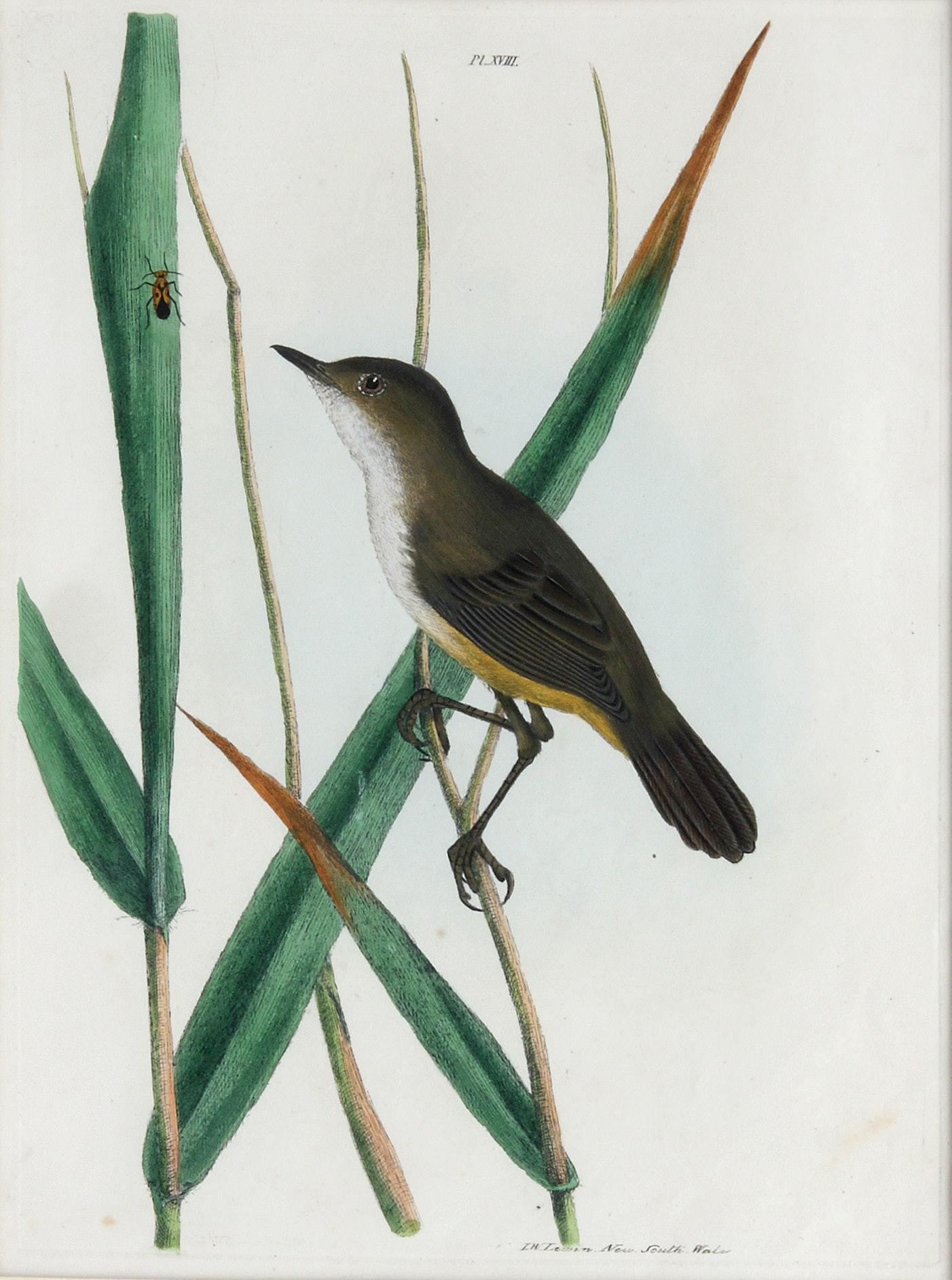 After Lewin’s death in 1819, his widow Anna returned to England, where she set about pro ducing a new edition of her husband’s beautiful book, adding an extra eight plates for the new edition, this plate being plate XVIII from Lewin’s A Natural History of the Birds of New South Wales published in 1822.