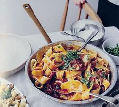 Pappardelle med rosenharissa, sorte oliven og kapers (side 188) er en meget nem og meget velsmagende ret, som jeg flere gange har tilberedt når jeg har fået gæster. Og så har jeg ofte tilberedt bagte cherrytomater med kold yoghurtsauce (side 70) som ekstra tilbehør, når jeg har godt kød på menuen, som fortjener lidt ekstra godt.
