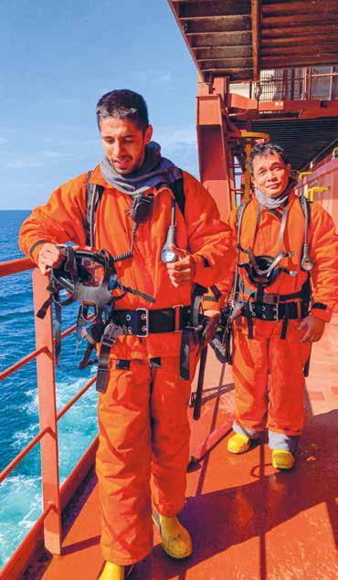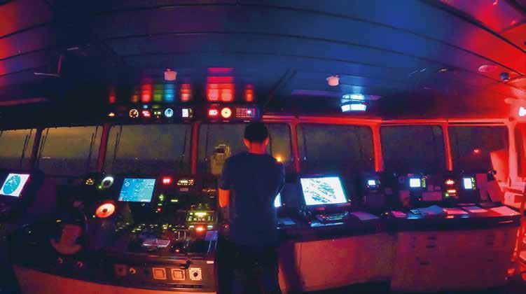 kollega hjælper mig med at holde øje med små skibe. Jeg modtager opkald og håndterer indgående og udgående beskeder. Jeg skal hele tiden have styr på sikkerheden og alarmer. Jeg skal bevæge mig rundt, og jeg går nemt 10.000 skridt på en nattevagt, når vi ligger i havn. Det kan være meget varmt og fugtigt, og man bliver dehydreret.”