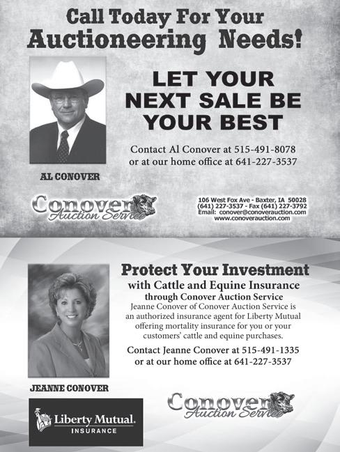 Nansel’s Flying Ranch LOT 130 LOT 5A RETIREMENT DISPERSION LOT 37A LOT 105A LOT 43A LOT 93A LOT 113A AL & JEANNE CONOVER PO Box 9, Baxter, IA 50028 641-227-3537 • Fax: 641-227-3792 www.conoverauction.com conover@conoverauction.com PRSRT FIRST-CLASS U.S. POSTAGE PAID St. Joseph, MO Permit #2017