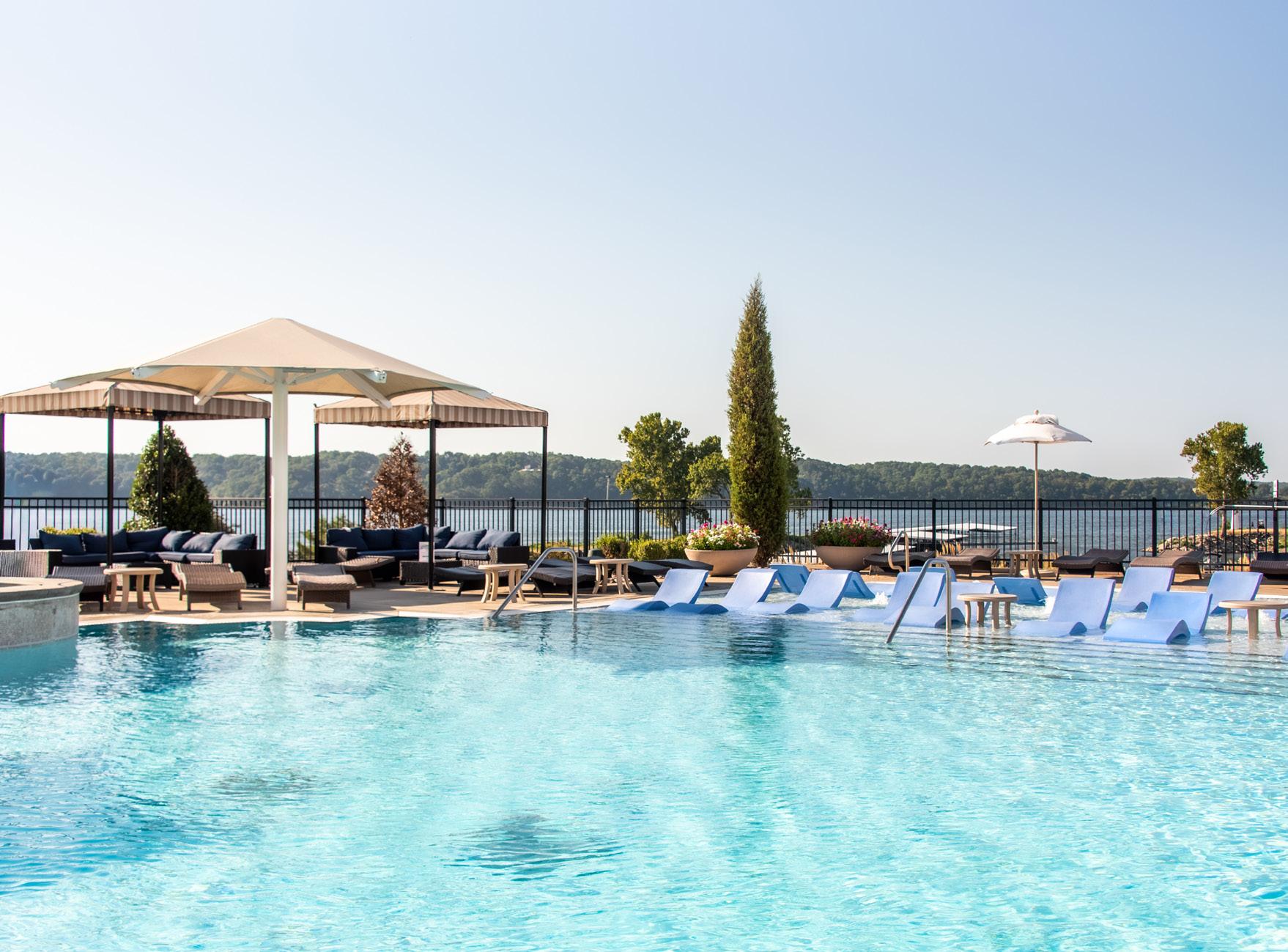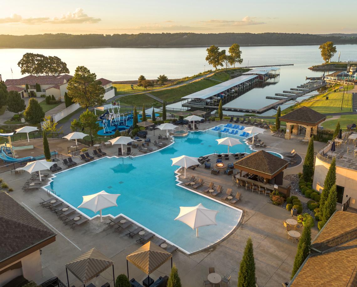 Resort Pool: Access for guests and members; towel service, hot tub, splash park, pool bar, and fire pits.