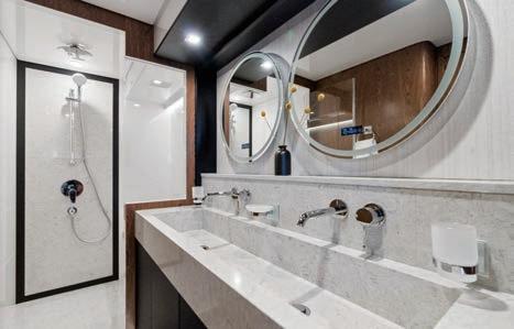 Accessed via a starboard stairwell positioned opposite the salon, spacious guest accommodations on the lower deck make good use of the over 23-foot beam. e layout comprises mirrored VIPs amidship, a portside forward VIP, and another VIP in the bow, each out tted with queen-size beds and 43-inch TVs. Notably, the forward VIP suite maximizes storage with an electrically actuated lift for the bed base, aided by a gas-assisted telescopic rod. e consistent and generous use of stone throughout the ensuites further enhances the sense of airy brightness and re ned elegance.