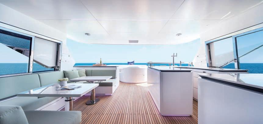 Sliding doors lead to the open Skylounge, which o ers a Hi-Lo sliding table, U-shaped seating, a Rhino three-door refrigerator, and an ice maker to starboard. Situated to port is a whole host of amenities for outdoor entertainment, including a bar with three bar stools, a beer chiller, a teppanyaki grill, and a 43-inch TV. A central circular Jacuzzi tub is accompanied by a wet bar and ottomans. Ample space for tender and stowage is accommodated on the boat deck, while the foredeck provides another lounging and dining area with a sliding table.