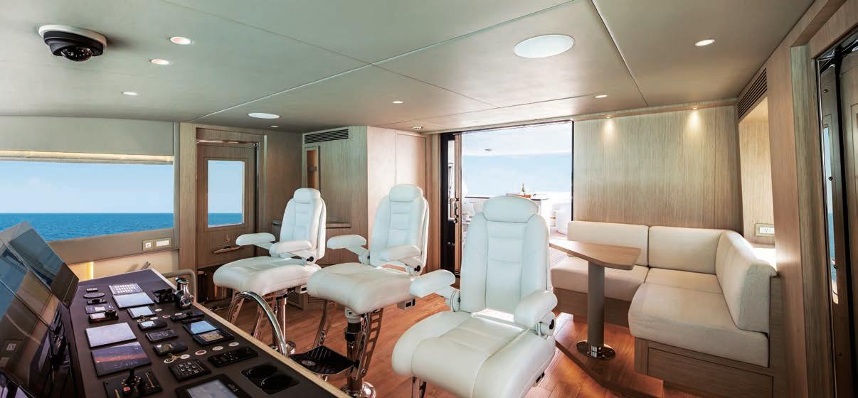 Function meets comfort in the pilothouse, an enclosed space with good lines of sight. Here, three Pompanette helm chairs nished in Ermine Ultraleather are positioned atop Cadorin Rock oak ooring. For added convenience and comfort, a convertible L-shaped sofa and table reside to port while a dayhead is situated to starboard.