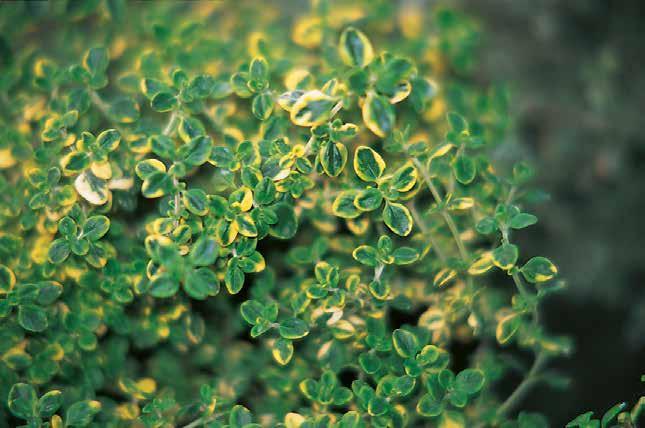 Guldgul brokig timjan med starkt, upprätt och buskig växtsätt. Med citrondoft.