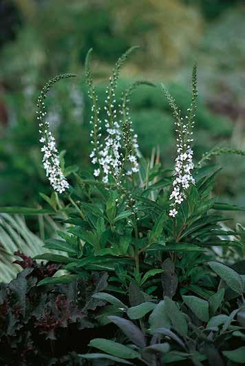 Runt, storbladigt och kraftfullt bladverk som främst bidrar med struktur. Ett attraktivt och härdigt tillskott med sporadiska vita blomspiror.