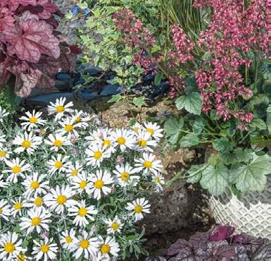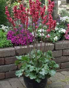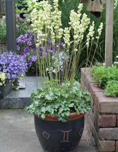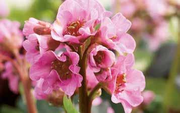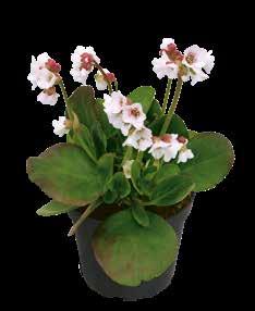 Bergenia ‘Harzkristall’ Över en kompakt bladrosett stiger många korta blomvippor. De stora, vita till rosa färgade blommorna gör sig väl i stora krukor.