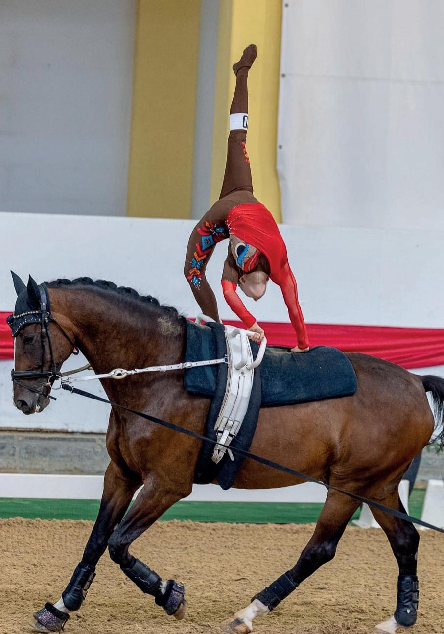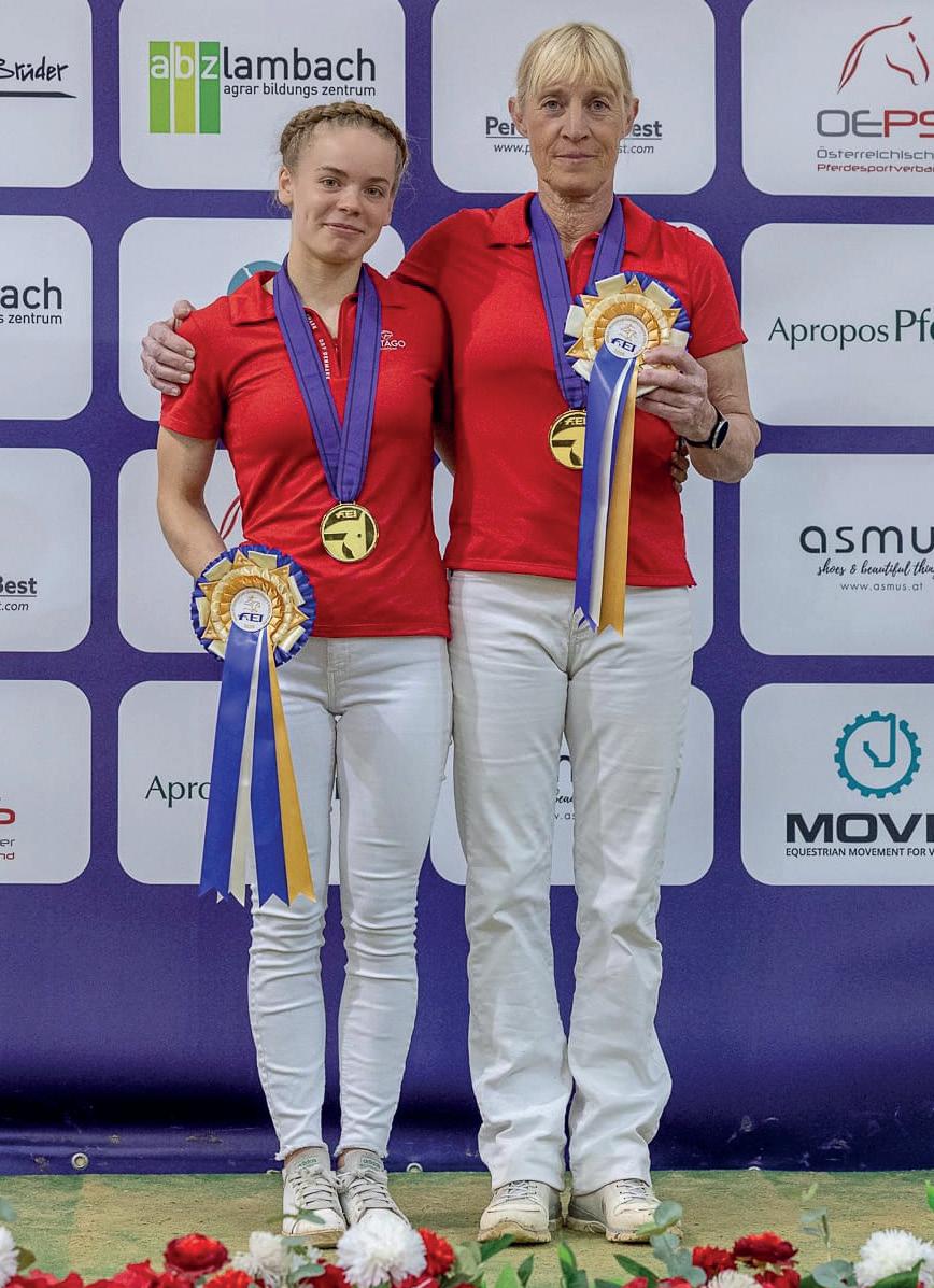 SKIBBY: Longefører Hanne Haagen Hansen, hesten Sultan EG (kaldet Søren) og Josephine Nielsen vandt guld ved verdensmesterskaberne i voltigering i Østrig lørdag 2. august. Sultan EG er ny i voltigering og har kun voltigeret i syv måneder. Så selvom manges anså Josephine og Hanne som nogle af favoritterne i år efter sidste års EM-guld medalje, så var deres egne forventninger måske mere realistiske om at alt kunne ske med en ny hest i en stor arena med meget publikum.