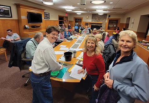 woodland moss, twinkling lights and live hyacinth centers. Throughout the hall were just enough iridescent snowflakes to reflect the clear night sky outside. The social hour gave everyone a chance to relax and get reacquainted. Carolyn Sullivan provided a revolving slide show of our SCOHC history over the past 15 years as a backdrop to see just how far we have come and all who contributed along the way. Also, Marietta Tromp presented the best two minutes and 28 second short film titled Handling Horse Encounters in CVNP. Marietta made sure the six golden rules were easy for all to understand and the points were demonstrated by members with their animals. We retired to a buffet of generous proportions and savored the fine fare. The meal was capped off with Debbie Donner’s artful cake with the chapters’ OHC emblem and horse shoe shaped center. Next, the awards portion was hosted by Amy O’Neil. Both clubs presented members with prizes and/or gift certificates for their 2022 trail miles turned in and volunteer/service accomplishments. Of course, we have Big Dee’s Tack and Vet Supply in Streetsboro to thank for supporting those efforts with their points incentive program