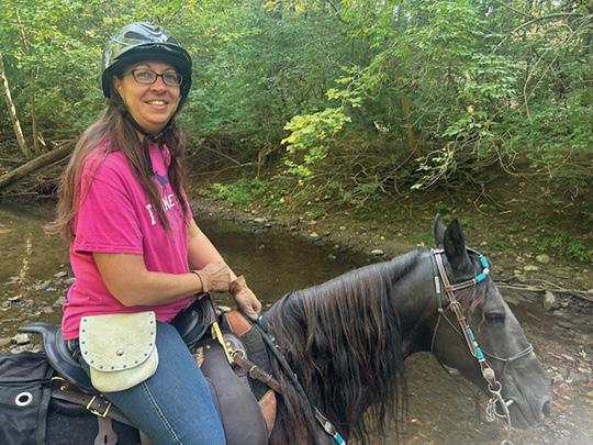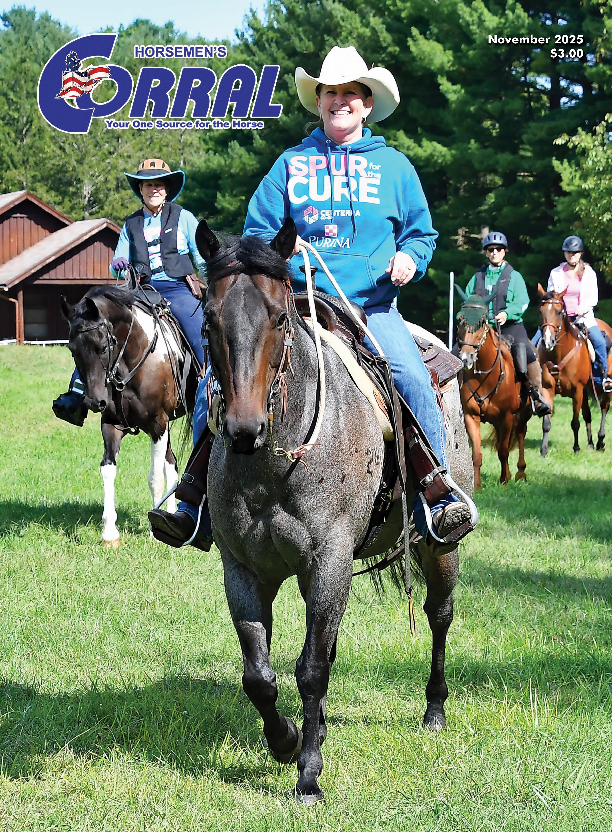 ABOUT THE COVER: Centerra/Purina’s Spur for the Cure Benefit Trail Ride at Camp Manatoc in the CVNP on Sept 6, 2025 - a great way to support our community (Akron Children’s Hospital) while having fun with our horses! Ann Hornsby (Medina) and Blueberry lead the second ride of the day! Amazing photographs provided by Mike and Deb Petcher.