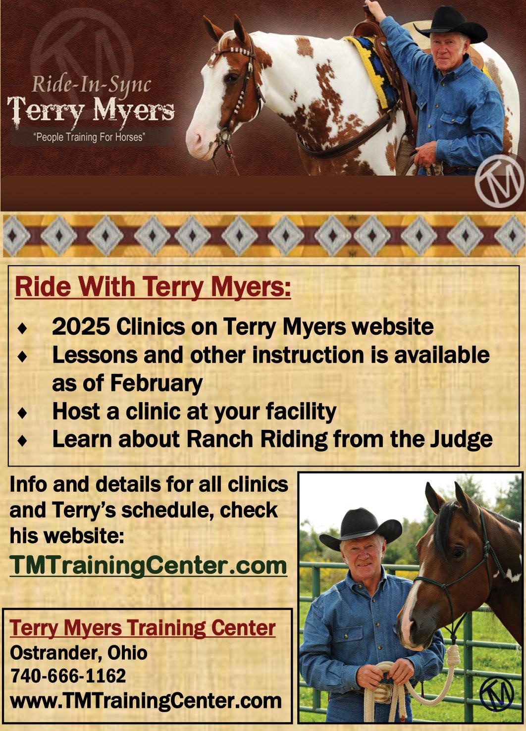 Terry Myers is a national clinician and champion horse trainer with a depth of knowledge developed from over 50 years in the horse industry. Myers has been a popular clinician at multiple expos in the U.S. and Canada. To learn more about Myers’ Ride-In-Sync methods as well as clinic and training services available, visit www.tmtrainingcenter.com or on Facebook.