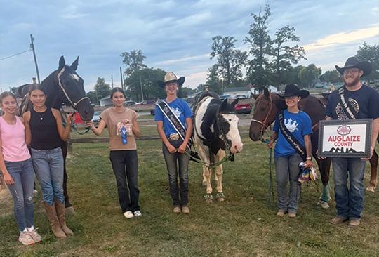 We started the month with a week long fundraiser, selling tickets at the Wayne County Fair. Our gate was directly across from the Clydesdales which was a big plus. The weather was very warm and dry so turnout for the ‘Greatest Junior County Fair’ in the state of Ohio was extremely good. Taran Tate had a good fair. He was chosen to serve as an attendant on the King and Queen’s court. He also won Senor Ground Roping Champion and had a lot of success showing Gus and Doc in western pleasure and contest classes. Tammy Burkhart and Jody Jackson rode their horses, Alibi and Cortez and Phineas to park cars at the fair. They were a great representation of what a help horsemen can render.