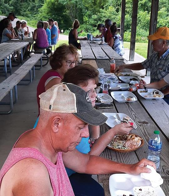 At 5 p.m. we had a potluck supper with dozens of ears of corn cooked in the big pot over a roaring fire. Thanks to Bill Hoover for the pot and being the head corn cook! We had birthday cake and homemade ice cream to celebrate senior member, Betty Adams’s birthday. We