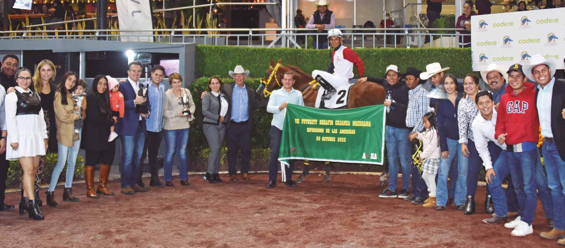 Este Futurity inició en 2014 con el nombre de Mexican Bred Cha llenge Juvenil y a partir de 2017 tomó el nombre de Desafío Crian za Mexicana. Hay que anotar que Ismael Parra lo ganó como jinete en 2015 montando a Game Samba so y ahora como entrenador con Br Enamorado